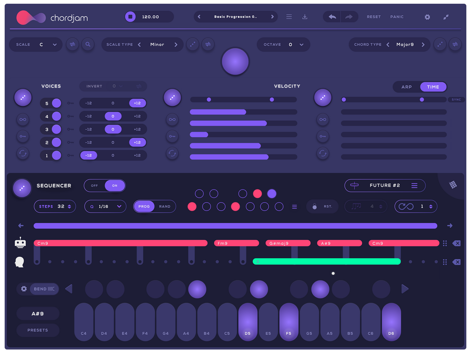 Användare kan välja mellan en mängd olika skalor och ackordtyper, voicing-parametrar, samt både rytmer och progressioner, eller låta dess kraftfulla sequencer framkalla ett obegränsat antal progressionsmönster baserat på vilken kombination av inställningar som helst för att servera oförutsägbara men alltid musikaliska variationer...