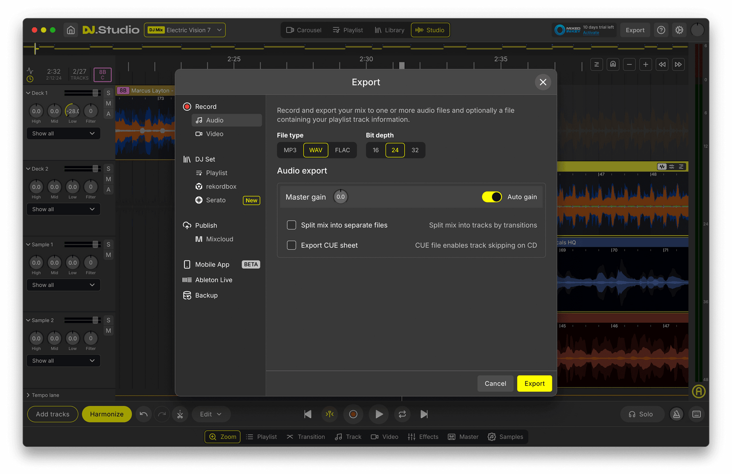 - Exportera: MP3- och WAV-filer, DJ-set (M3U), Mixcloud, Ableton live