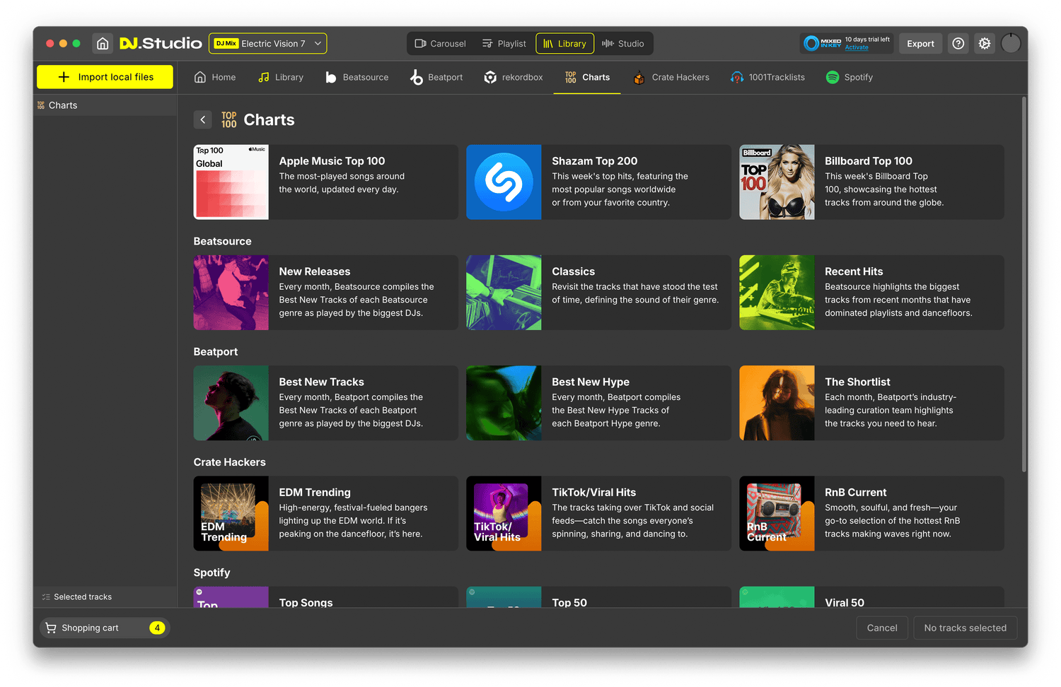 - Importera musik från lokala bibliotek inklusive iTunes, rekordbox, Serato, VirtualDJ, Mixed In Key, Engine DJ, Traktor, eller bläddra bland lokala filer (MP3, WAV, AIFF, FLAC och mer).