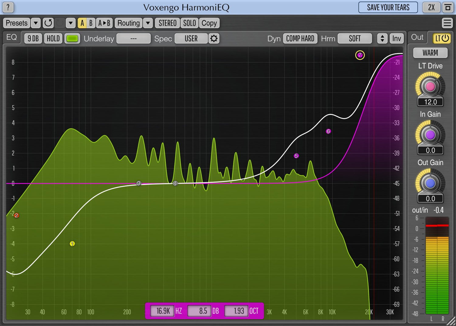 Ett annat användbart element av HarmoniEQ är dess kontrollytas frekvensområde som sträcker sig upp till 38 kHz. Detta utvidgade område gör att du enkelt kan göra mjuka "luft"-boostar. Medan HarmoniEQ är bäst lämpad för EQ-boostar, låter dess EQ-sänkningar också fantastiskt.