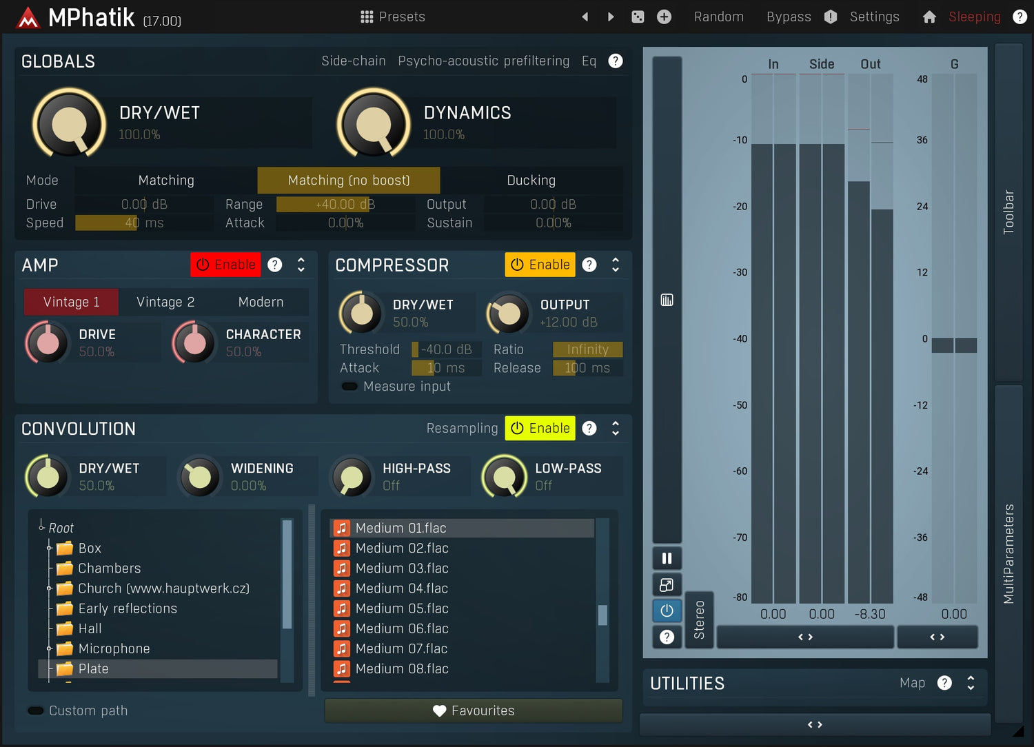 MPhatik kommer utrustad med en kraftfull amp-simulator, convolution reverb (som innehåller alla typer av impulsrespons från plattreverb till hallar, rum etc., eller dina egna IR-filer såklart) och en kompressor. Om det inte är tillräckligt kan du också använda sidokedjan för att driva MPhatik och bearbeta ljudet med dina egna verktyg, vilket lämnar MPhatik att återställa dynamiken.