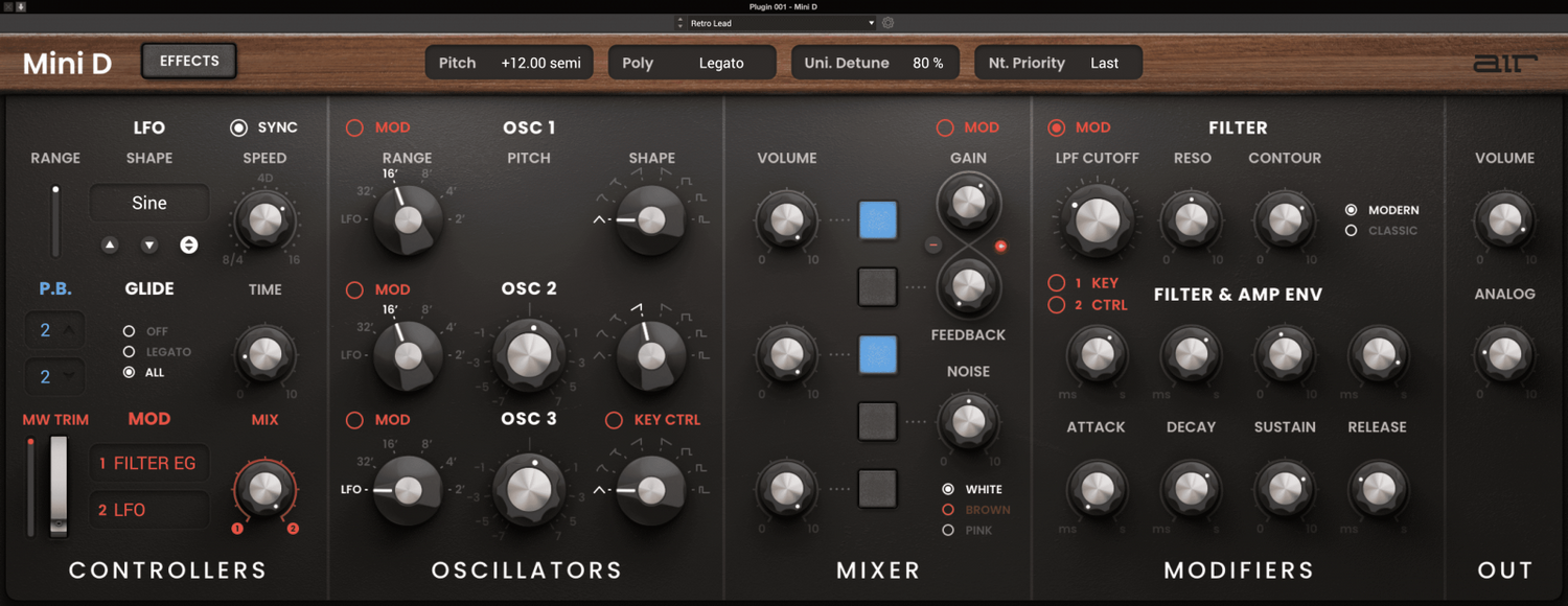 Byggd av det världsberömda Air Music-teamet i Tyskland, kommer presets i Mini D att inspirera dig! Med över tio kategorier som sträcker sig från bas till leads till synth FX, kommer du säkert att hitta ljud som kan användas omedelbart i din nästa låt eller som utmärkta utgångspunkter för att experimentera och anpassa dina egna toner.