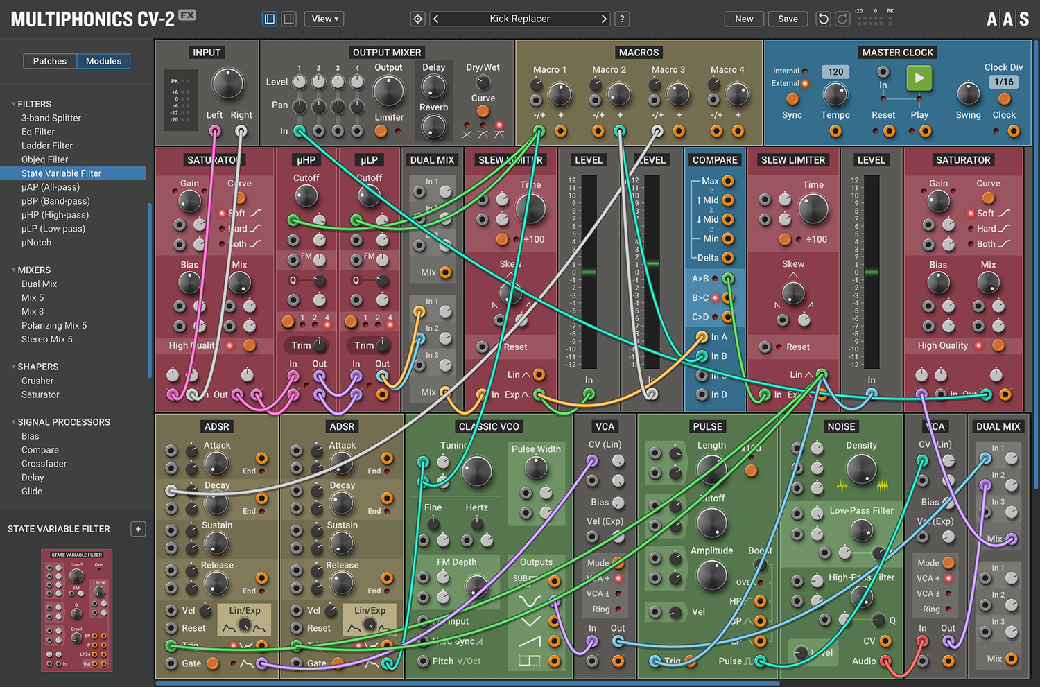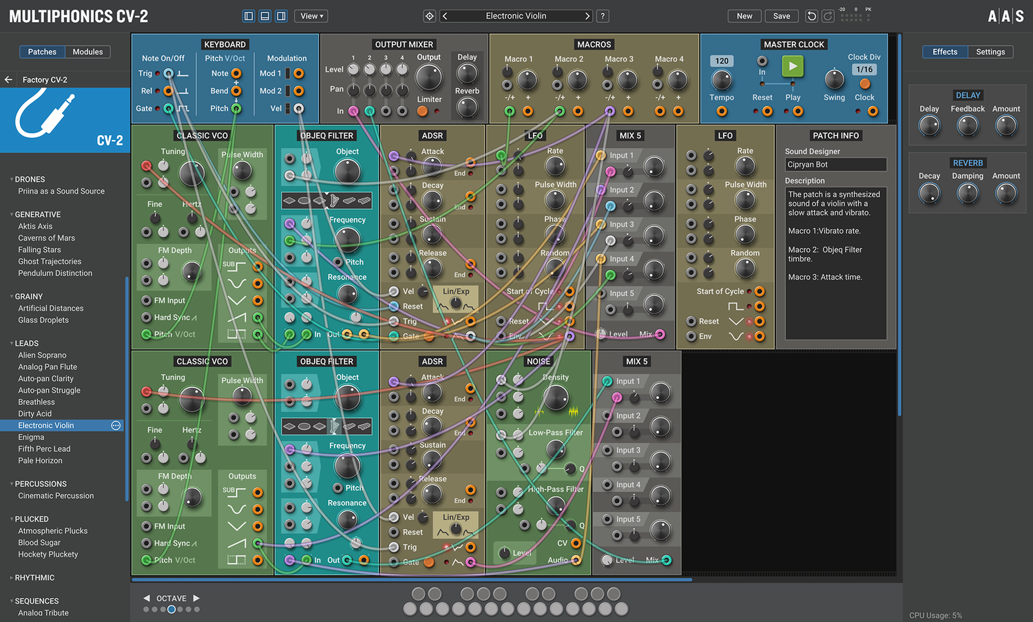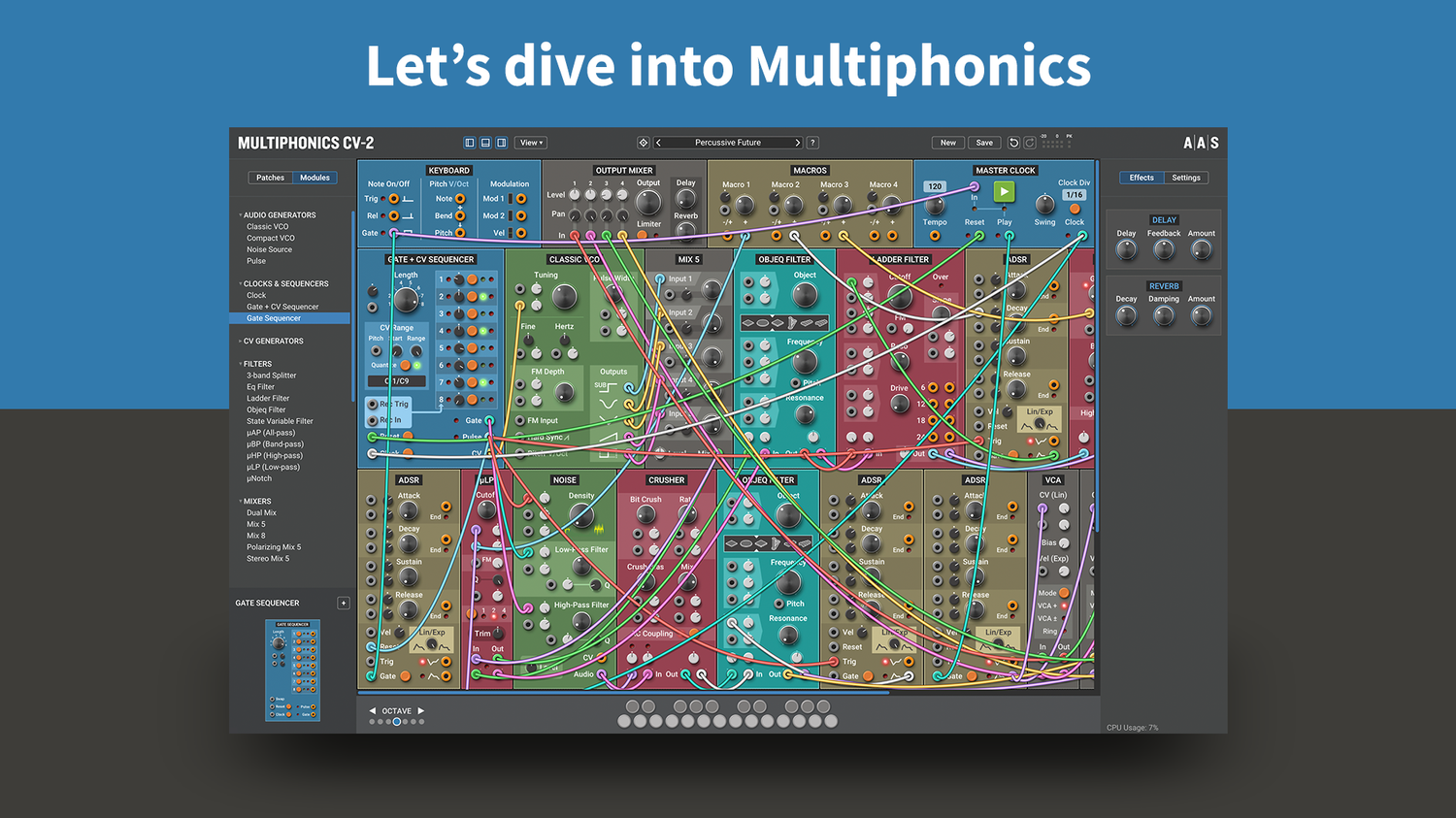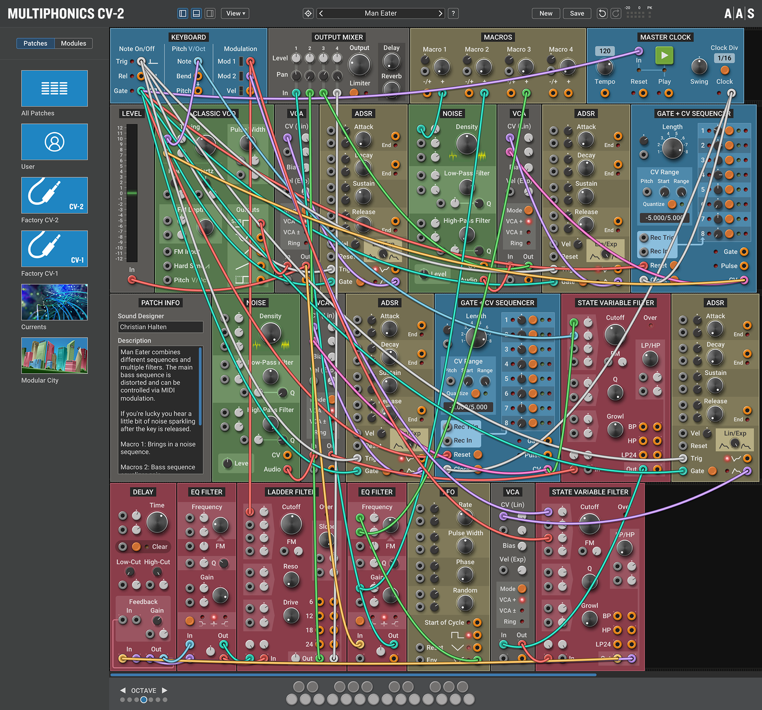 Multiphonics CV-2 är en mångsidig modulär plattform för att sammanställa och spela patchar. Med ett enkelt och tydligt interface är Multiphonics ett snabbt och effektivt skapande verktyg för musiker och ljuddesigners. Det är också en utmärkt lärandemiljö för nykomlingar. I kärnan av Multiphonics finns ett omfattande bibliotek av moduler, från grunderna till unika och sofistikerade original, samt ett stort och inspirerande bibliotek av patchar skapade av topp ljuddesigners.