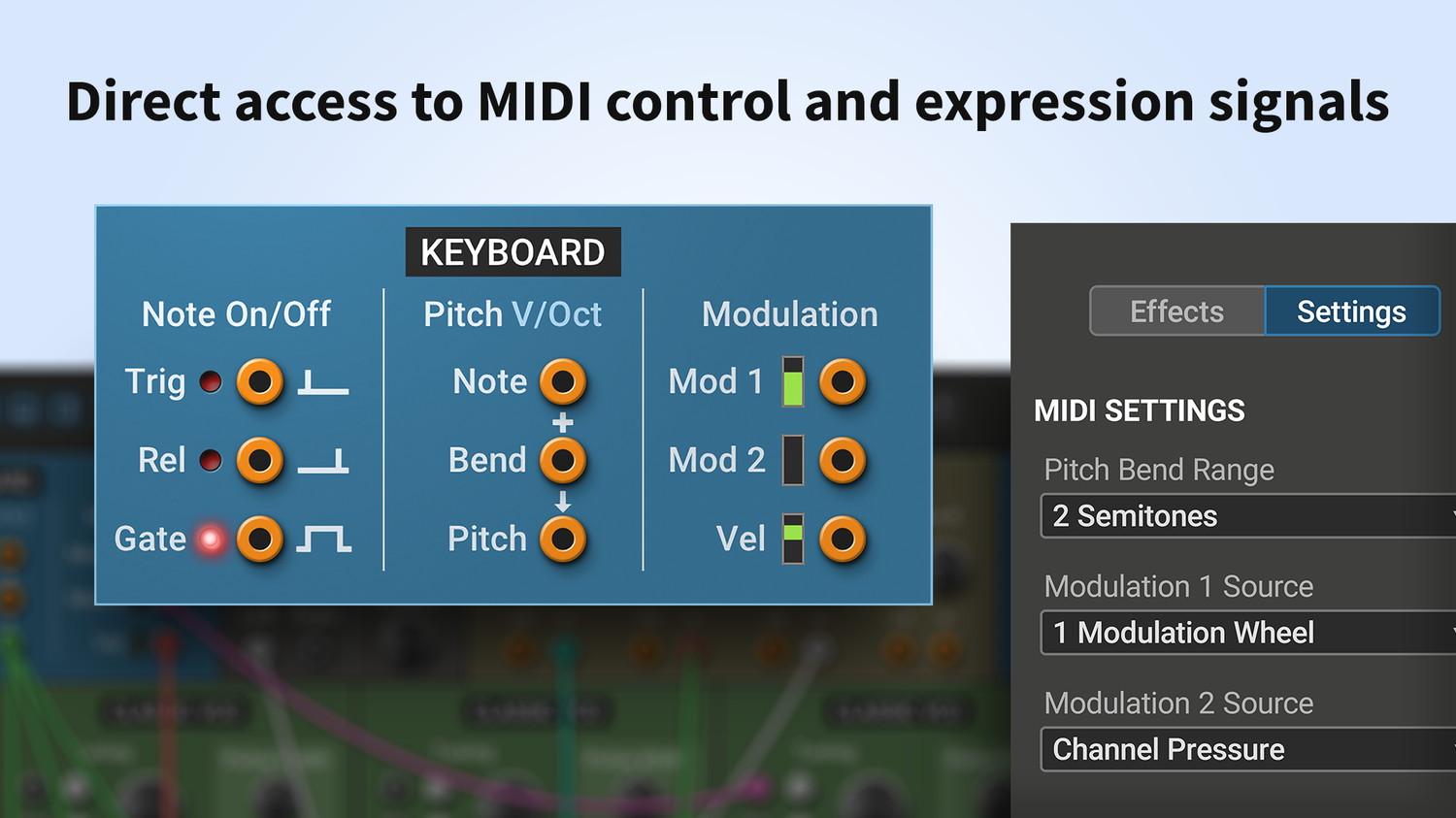 • Multiphonics kan nu användas som en effektprocessor. • 15 nya moduler • 6 förbättrade moduler • 100 nya effektpatchar • 50 nya synthpatchar • Stereo patchning • En-till-många modul patchning • Många-till-många modul patchning • Multimodulåtgärder • Förbättrad webbläsare • Skalable UI