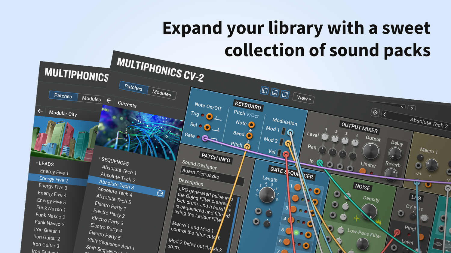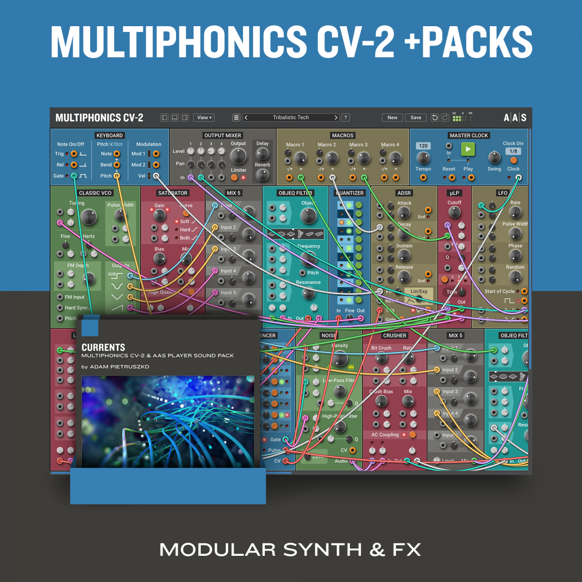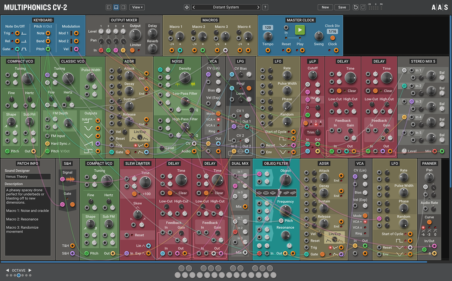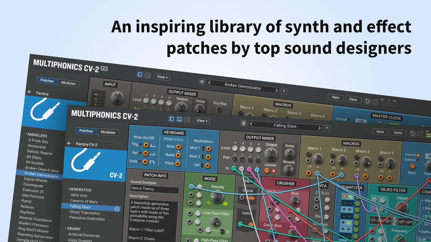 Multiphonics CV-2 är en mångsidig modulär plattform för att sätta ihop och spela patchar. Med ett enkelt och tydligt interface är Multiphonics ett snabbt och effektivt skapande verktyg för musiker och ljuddesigners. Det är också en utmärkt lärmiljö för nykomlingar. I kärnan av Multiphonics finns ett omfattande bibliotek av moduler, från grunderna till unika och sofistikerade original, samt ett stort och inspirerande bibliotek av patchar skapade av topp ljuddesigners.