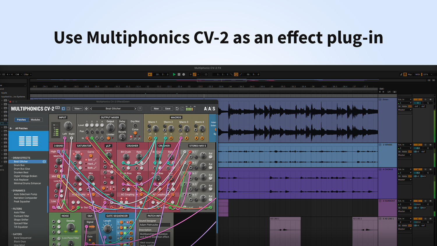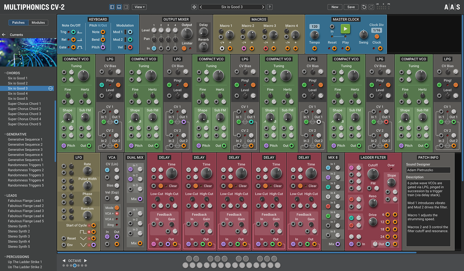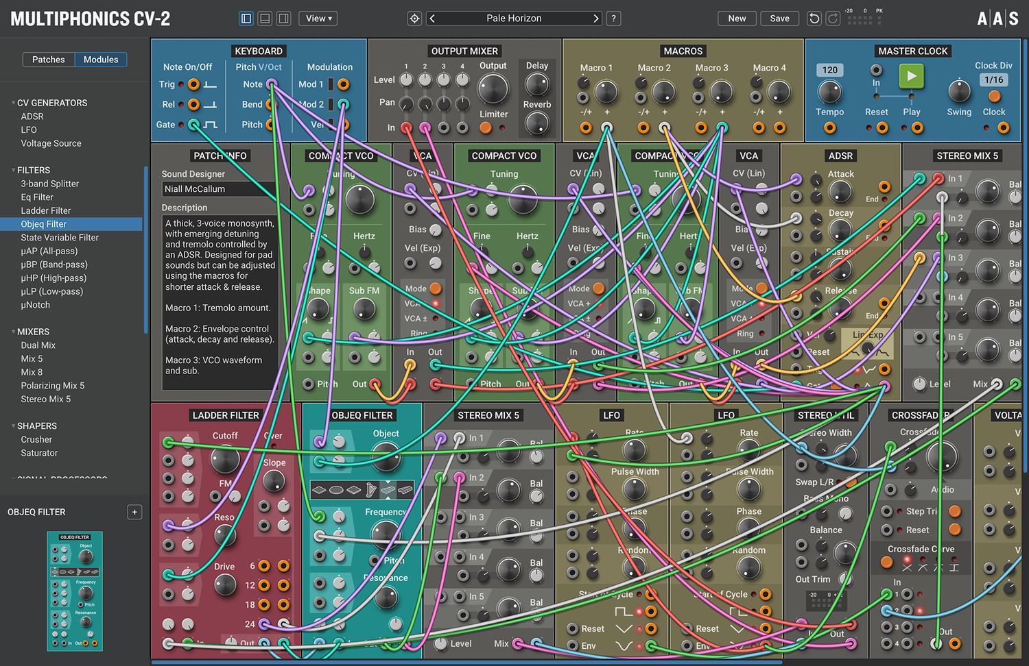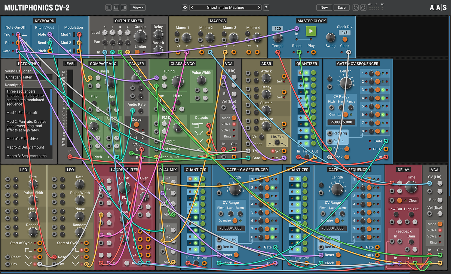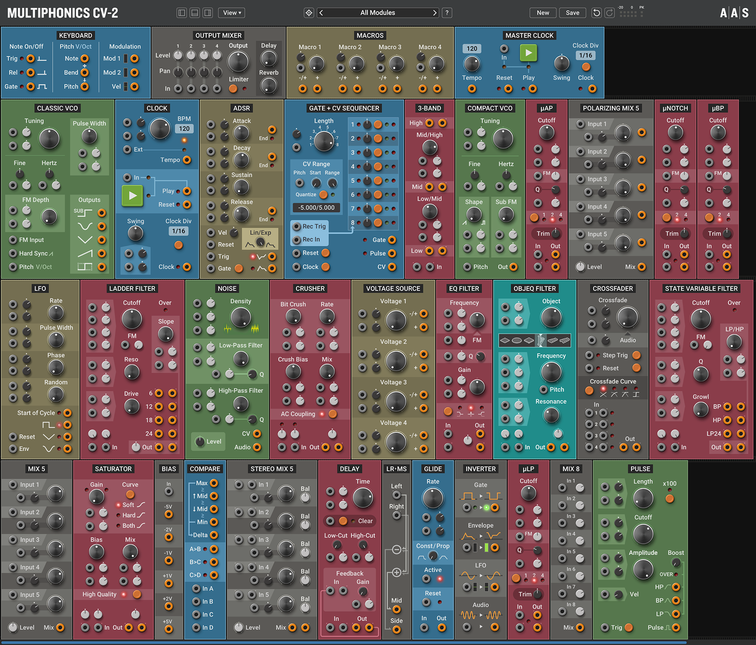 Multiphonics CV-2 är en mångsidig modulär plattform för att sätta ihop och spela patchar. Med ett enkelt och tydligt interface är Multiphonics ett snabbt och effektivt skapande verktyg för musiker och ljuddesigners. Det är också en utmärkt lärmiljö för nykomlingar. I kärnan av Multiphonics finns ett omfattande bibliotek av moduler, från grunderna till unika och sofistikerade original, samt ett stort och inspirerande bibliotek av patchar skapade av topp ljuddesigners.
