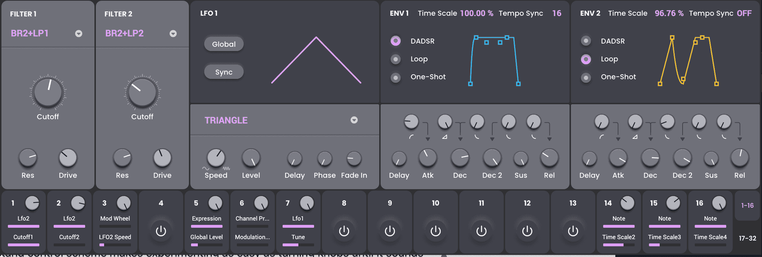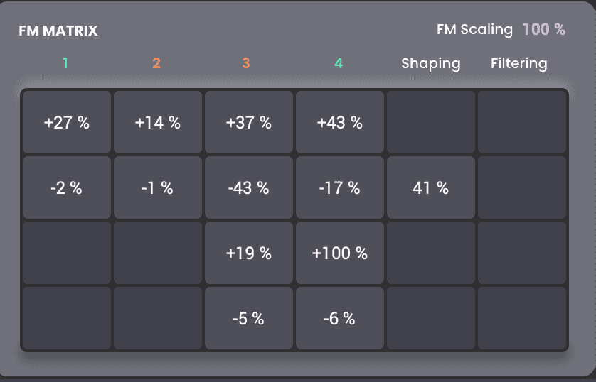 Genom att använda fyra FM-operatörer och en FM-operator matris kan du skapa nästan vilket FM-ljud som helst du någonsin har hört—eller till och med de du ännu inte har hört! Du kan justera värdena för varje operator med specifika kontroller på skärmen för pulsbredd, formant, FM-filtrering och FM-formning, samt specifika ADSR- och FM-oscillator envelope-kontroller.