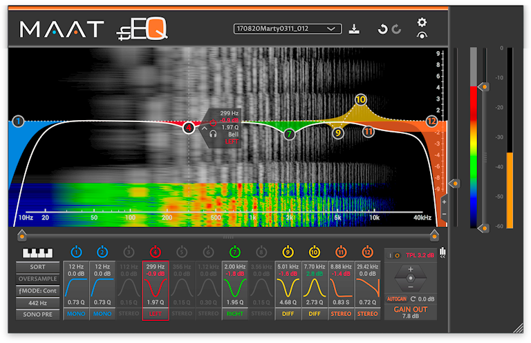 Idén föddes att återutge detta mästerverk och göra det tillgängligt som 64 bit i alla vanliga format och för macOS. Ett avtal med Algorithmix slöts, och MAAT startade upp i mitten av 2017. Algorithmix-fans hörde talas om detta och kontaktade oss och sa: “…bara gör det som det är; inga extra funktioner, inget annat. Vi vill bara ha det tillbaka i 64 bit och för Mac.” Det var uppmuntrande. Som en kraftanvändare hade Tischmeyer några andra idéer i åtanke gällande UI. Han ville göra det mer flexibelt och snabbare att använda eftersom det inte finns något annat verktyg i masteringkedjan som en ingenjör lägger så mycket inställningstid på. Resultatet? “Jag tror att vi har uppnått det. UI:t möjliggör super snabb inställning och har ett antal unika funktioner som hjälper till att göra så: Den positiva och negativa Contributions-funktionen inklusive absolut skillnad, den justerbara sonogrammet som gör det enkelt att upptäcka energipunkter som du vill rensa upp, och möjligheten att spela en ton på pianot du har i ditt huvud och bara trycka på den respektive frekvensen till den aktiva bandsektionen med ett högerklick är bara några av de nya funktionerna. Vad jag också gillar är att jag har en översikt över alla Sektioner till skillnad från bara en Sektion i taget.” För att inte hamna med en konstig Sektionordning när man använder många filter, har vi också lagt till SORT-knappen så att dina Sektioner alltid är i stigande ordning.