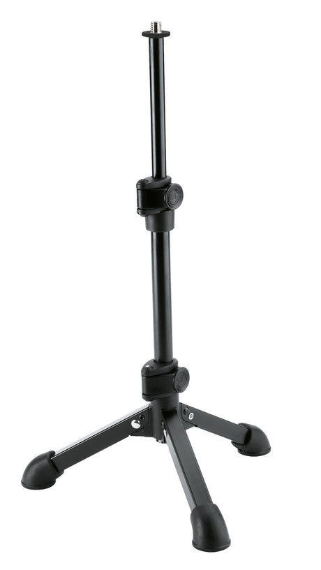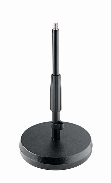 Låt oss börja från basen på mikrofonhållaren och se vad den står på. Vi erbjuder både trebenta mikrofonstativ och mikrofonstativ med rund fot. Båda typerna har ofta ett stötdämpande lager på undersidan som skapar ett litet avstånd mellan stativet och golvet. På så sätt överförs vibrationer som uppstår när du hoppar eller rör dig på scenen i möjligaste mån inte till mikrofonstativet.
