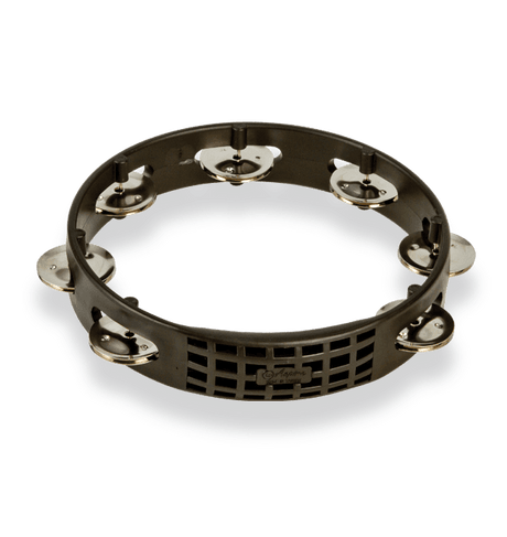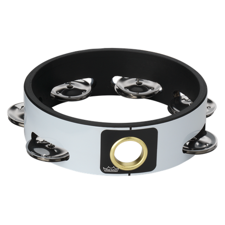En tamburin, som i sin klassiska form är med plåtbrickor och klockor, finns också med skinn.