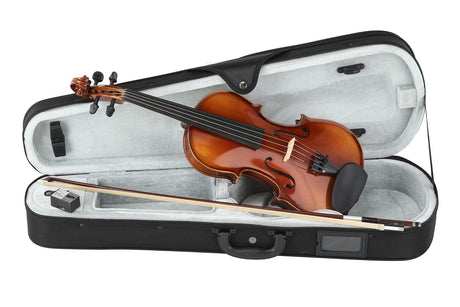 Basen du behöver för att komma igång - stråke och harts, axelstöd och strängar. En låda för förvaring och transport. En tuner för att stämma strängarna.