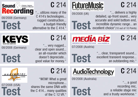 - C214 fångar ljud genom att kombinera en kapsel av det legendariska C414 dubbelkapselsystemet och den patenterade AKG Back-Plate Technology, vilket resulterar i en enastående prestanda nära den berömda C414 XLII.