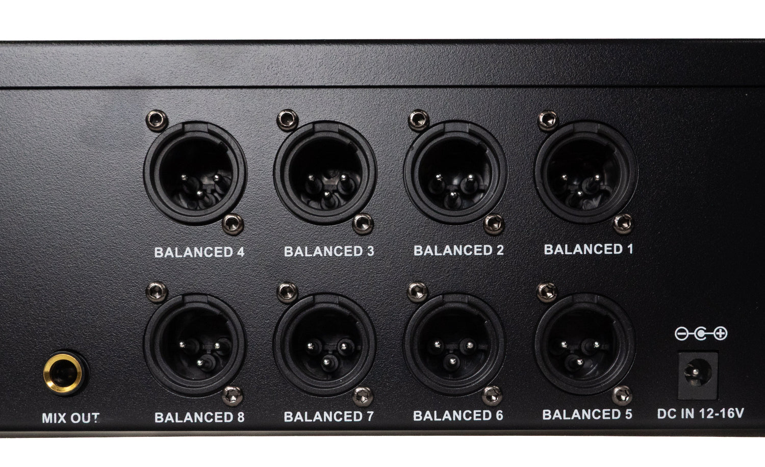 - Mixutgång, där alla 8 kanaler kan skickas på ett output, t.ex. till en aktiv högtalare (6,3 mm jack)