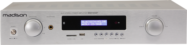 Kvalitets hi-fi stereoförstärkare med frontpanel i aluminium och fjärrkontroll.