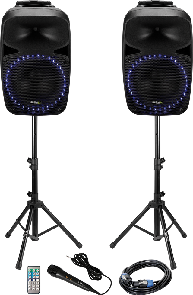 Komplett ljudsystem med mikrofon, fjärrkontroll och högtalare med lampor.