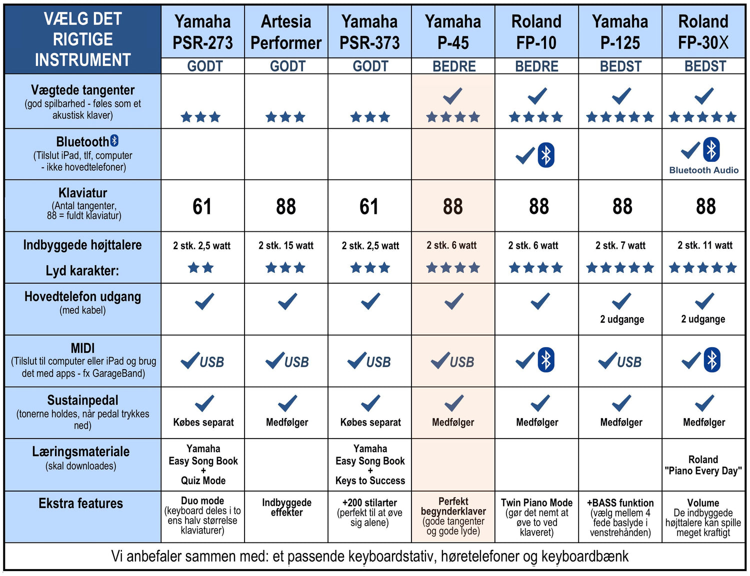 Förpackning med P-45, hållpedal, hållare för noter, kraftfull tangentbordstativ och bra hörlurar.