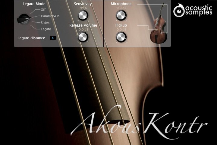 AkousKontr är en tysk 4/4 kontrabas med fyra strängar. Acoustic Samples har spelat in båda mikrofonerna med ett par elektrostatisk mikrofoner.