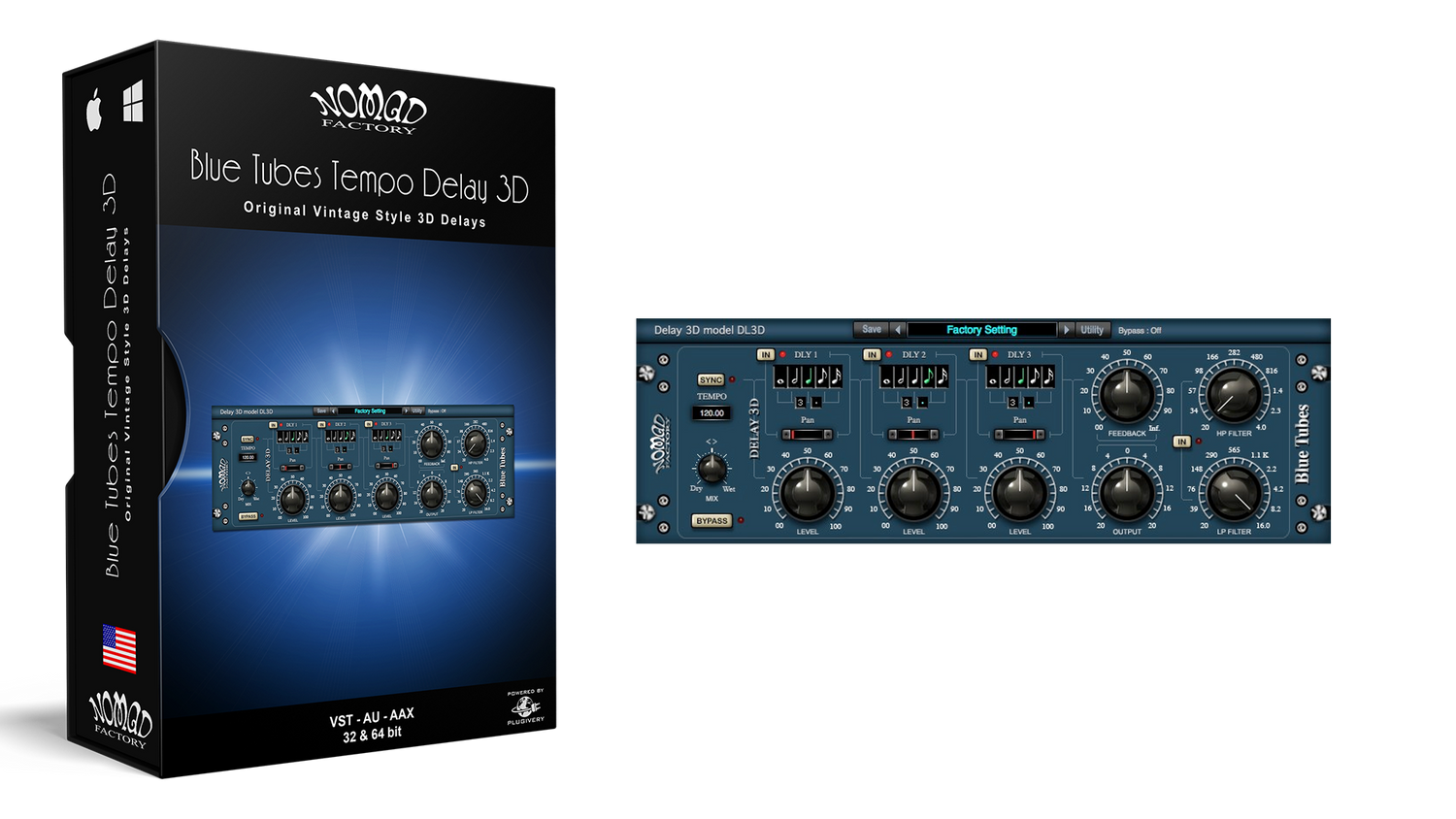 Denna delay erbjuder tre separata kanaler. Med Pan-kontrollerna kan du panorera alla tre delay-kanaler till mitten, eller sprida kanalerna över stereo-fältet (vänster, center, höger). Gain-kontroller ställer in nivåerna för varje kanal individuellt.