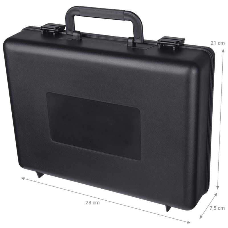 DNA UNIVERSAL CASEis a sturdy, durable, yet lightweight case for microphones, cables or other types of accessories, which will also successfully accommodate small audio mixers or other types of items. The product is made entirely of black plastic. It has ergonomically rounded corners, two locks in form of latches, a convenient carrying handle and two transverse feet so that it can be placed securely. Inside is a soft technical foam padding, which the user can personally adjust to the specific device so that it effectively holds the stored equipment in place. This is a sturdy yet inexpensive case for microphones, small mixers and other types of accessories, available at the best price!nbspTechnical specificationMaterialmolded plasticColorblackLockstwo latchesPaddingtechnical foamDimensions28 x 20 x 7.5 cmWeight0.3 kg