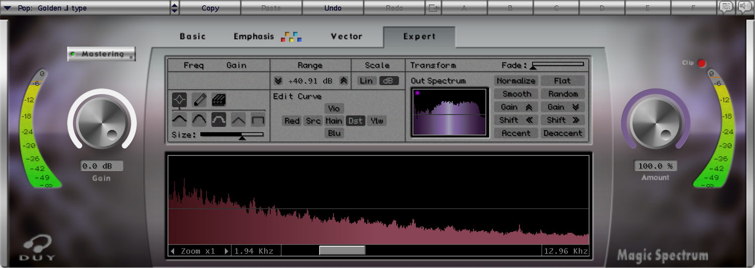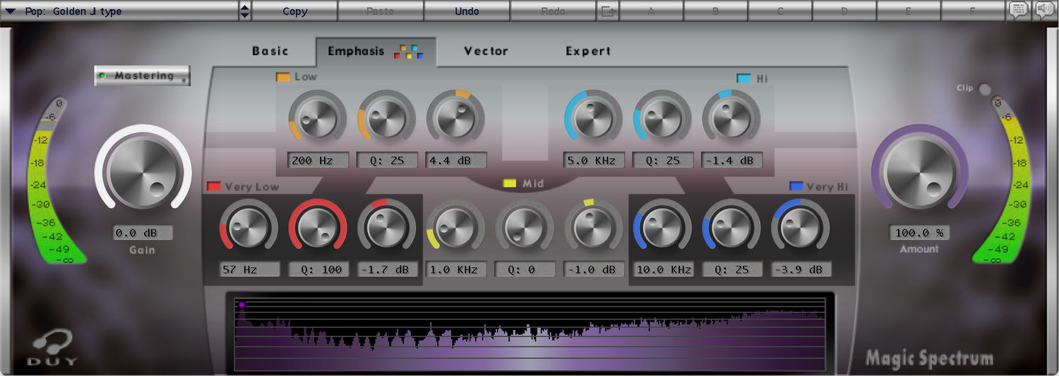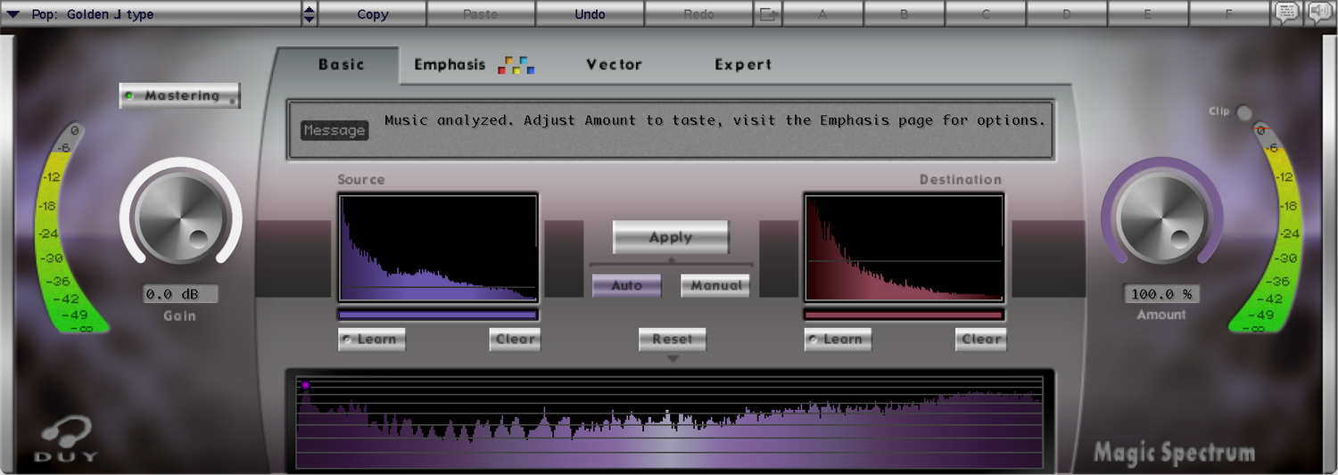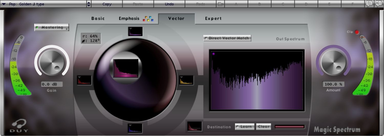 Om du inte har några låtar att använda som referens kan du också ladda någon av de många inkluderade förinställningarna. Dessa inkluderar analyser från några av de bästa inspelningarna genom tiderna, eller från specifikt klingande masters. Magic Spectrum kan också användas som en EQ, eller så kan du till och med ladda 4 olika svar och vektorielt kombinera dessa svar på det sätt du anser passar. Detta gör att du kan lägga till "mer karaktär" från ett ljud eller mer från ett annat...