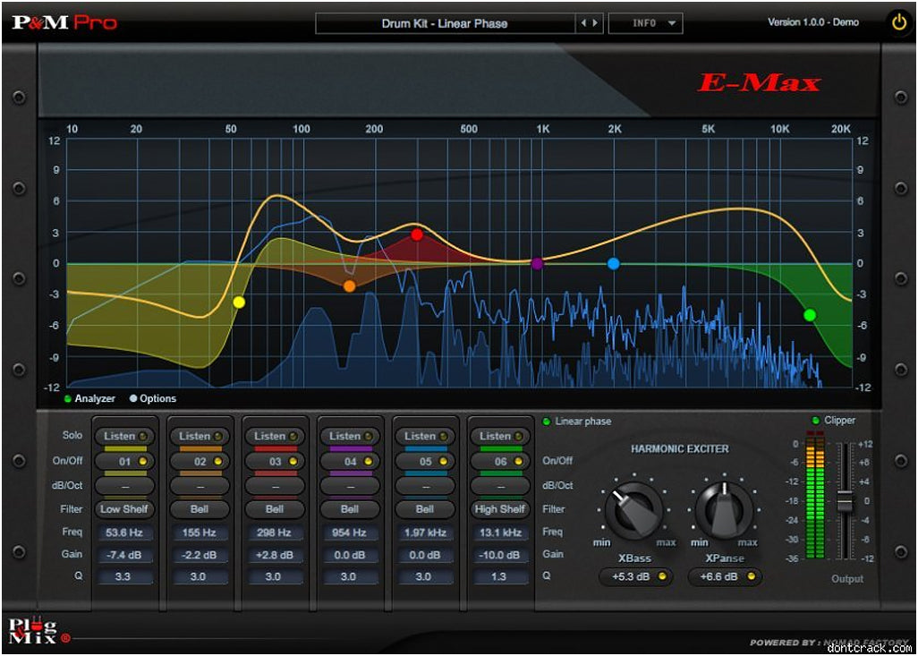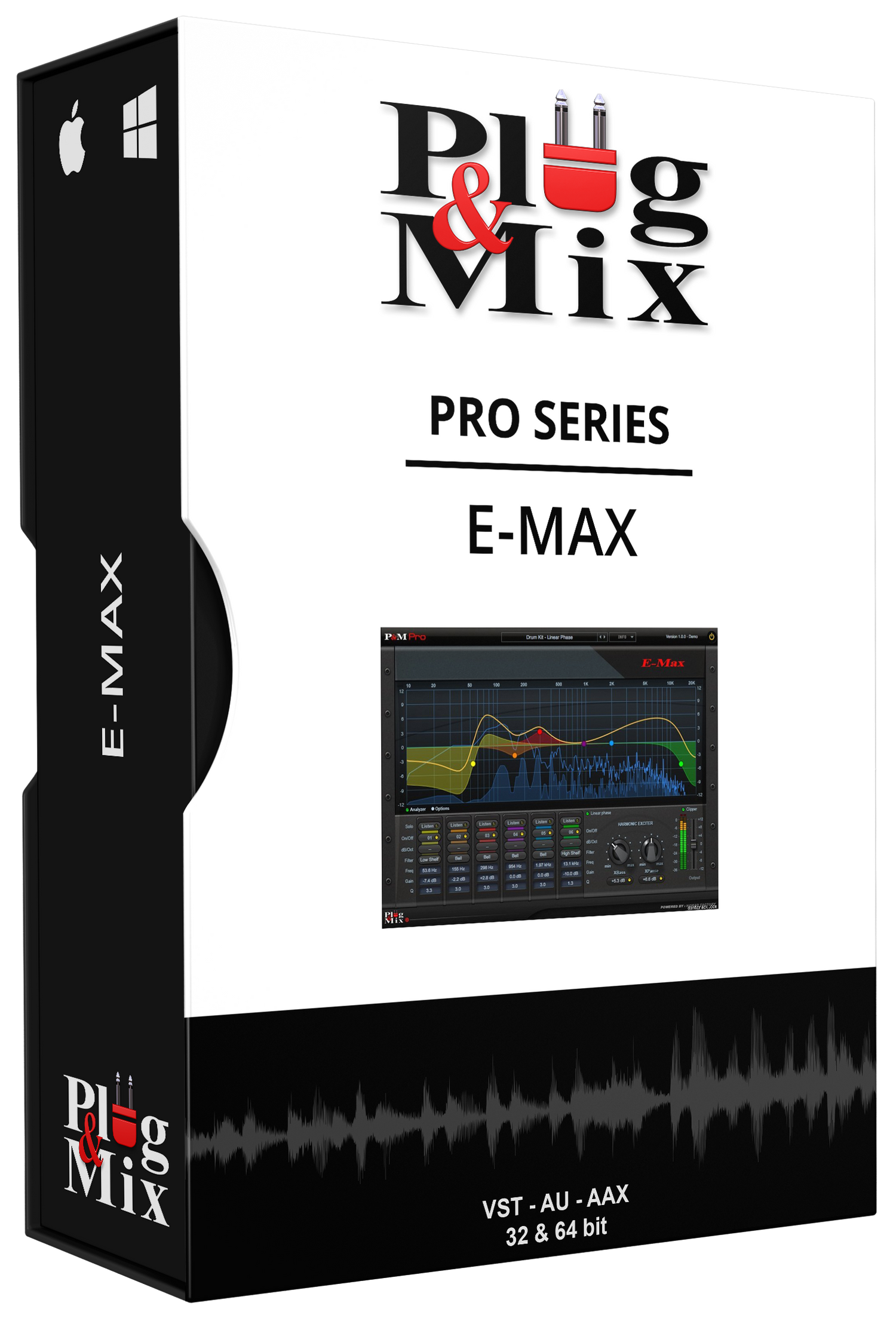 P&M E-Max Equalizer erbjuder det högsta kvalitetsverktyget för att forma ditt ljud med ett fantastiskt nytt interface för exakt kontroll. E-Max går bortom förväntningarna på en vanlig EQ med sin inbyggda Harmonic Exciter för extra "sweetening" och ett Linear Phase mode för mixing & mastering som bevarar transients och transparens i din musik.
