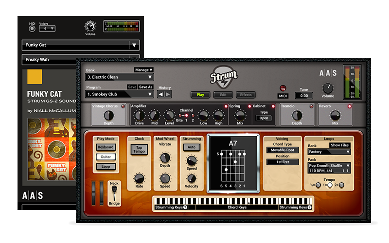 Med Funky Cat transporterar ljuddesignern Niall McCallum Strum GS-2 till funkens gyllene era — de grundläggande experimenten i groove från namn som Sly & The Family Stone, James Brown och The Meters. Från hackiga 16-delars riff fyllda med tighta, dämpade stötar till eleganta rytmiska ackordprogressioner, tar detta kalejdoskopiska nya set det allra bästa från spelets förfäder och skickar hela paketet rakt in i nutiden.