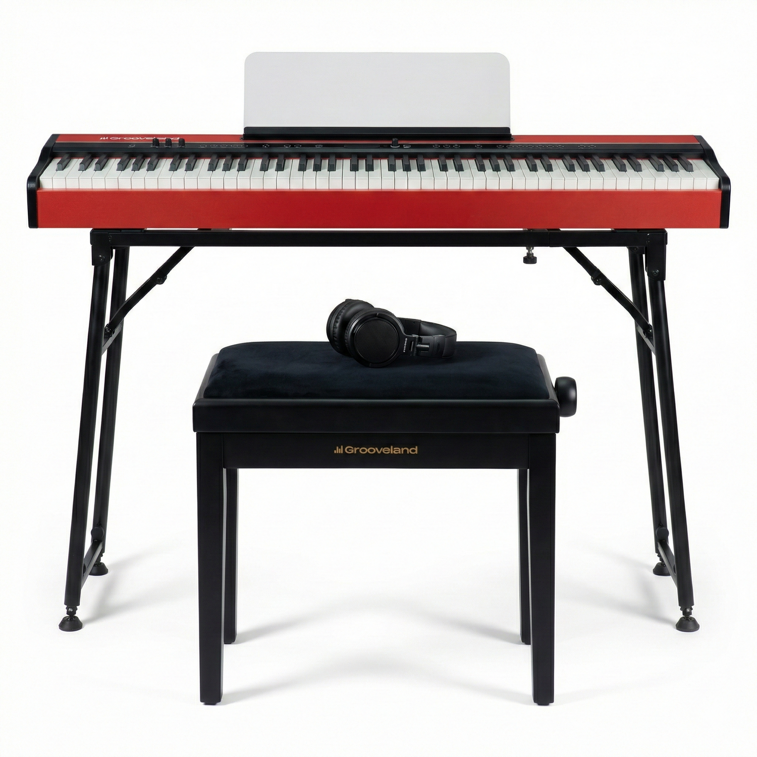 Med två hörlursutgångar (6,3 mm och 3,5 mm) kan du öva ljudlöst ensam eller tillsammans med en annan. Grooveland FP80 levereras komplett med sustainpedal och notställ, så att du har allt du behöver för att komma igång direkt.