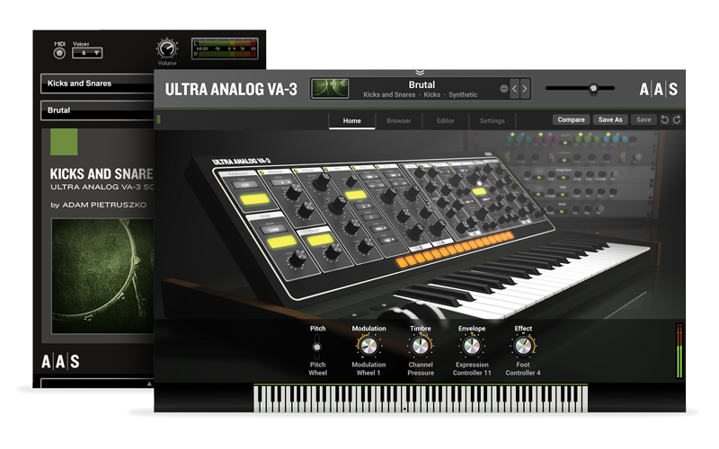 Du kan aldrig få för många kicks och snares! Resident sound designer Adam Pietruszko har skapat en expertmässigt utformad och smart samling av punchiga bastrummor och genomträngande snare presets i detta nya ljudpaket för Ultra Analog VA-3.