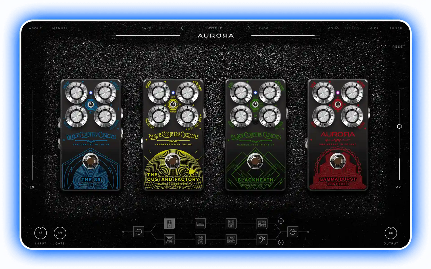 - Stomp section with 4 pedals with adjustable processing order.