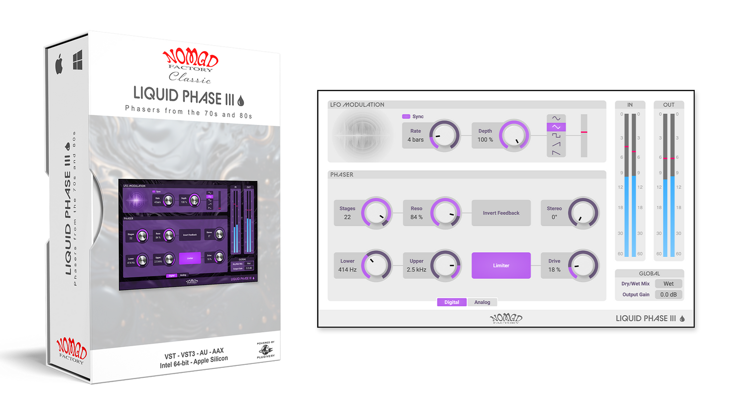 Liquid Phase III:s intuitiva design, komplett med stereo spread och ett justerbart interface, gör det enkelt att ställa in allt från subtil rörelse till djärva, resonanta svep. Modern kompatibilitet med VST3 och Apple Silicon säkerställer felfri prestanda i alla produktionsmiljöer.