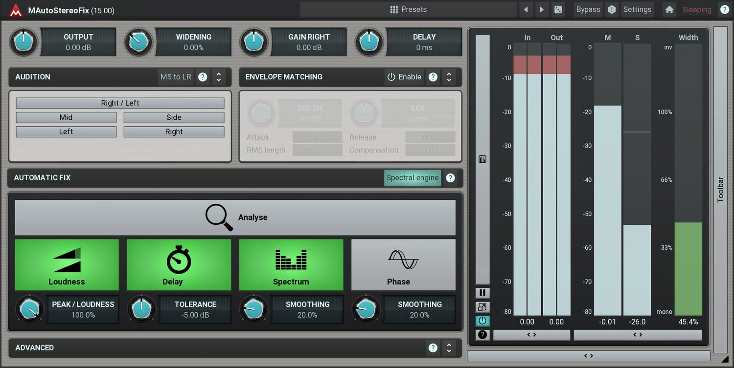 MAutoStereoFix är ett magiskt verktyg som åtgärdar problem i stereoinspelningar, även om du inte ens visste att det fanns några! Det har utformats för stereomikrofoninspelningar som overheads och rum, men kan också användas på mastertracks.
