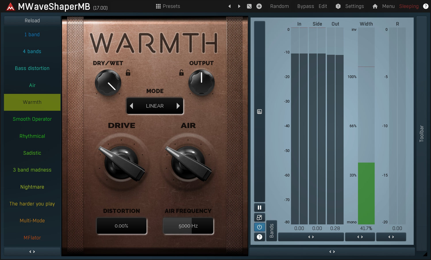 Waveshapers är de grundläggande distorsionsmodulerna men kan vara ganska begränsade. Men med MWaveShaperMB kan du rita dina egna former och bearbeta upp till 6 band separat. Perfekt för ljudmanipulatorer som söker en riktigt originell distorsion.