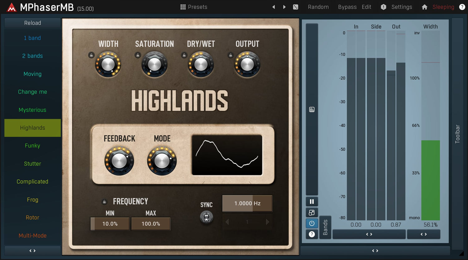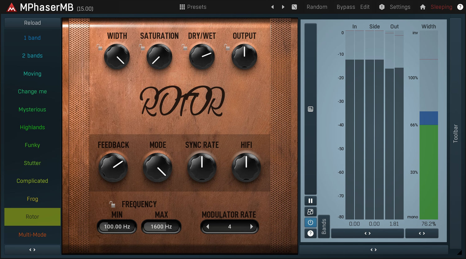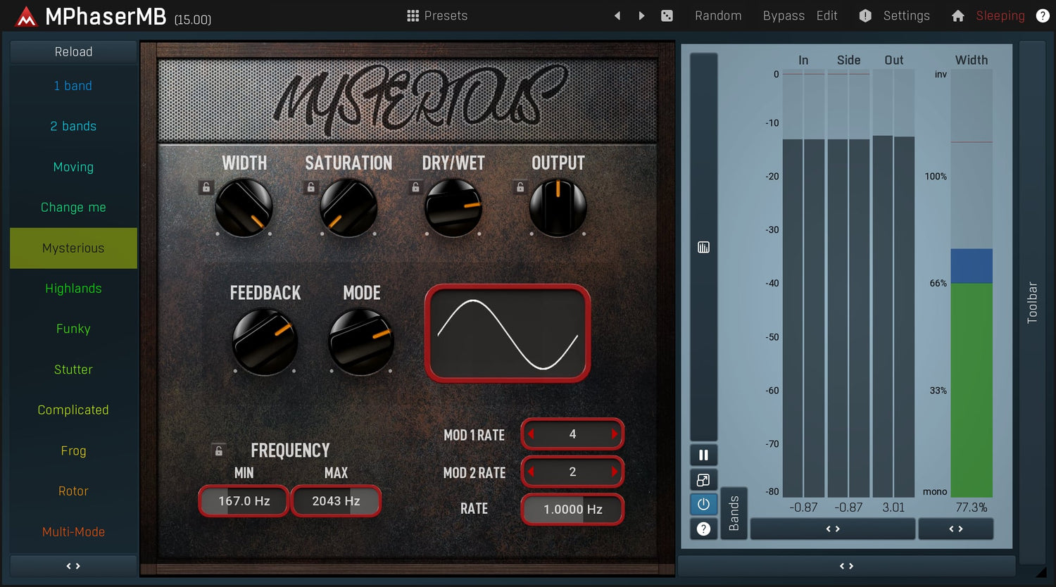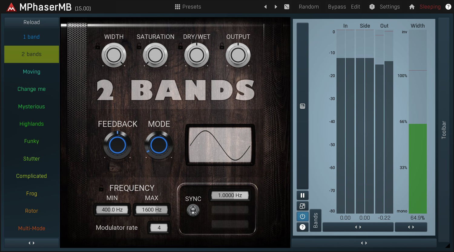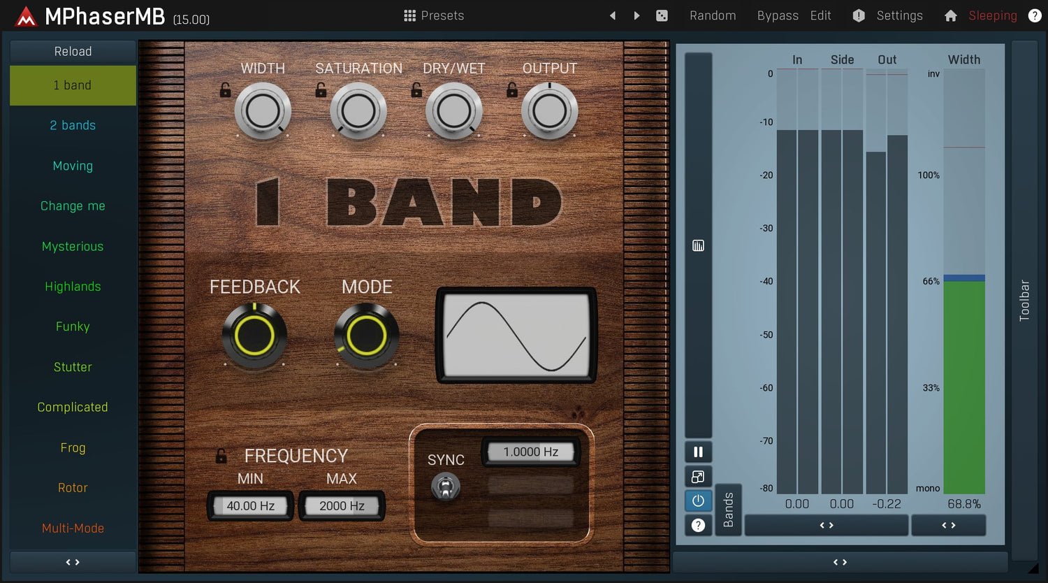 Phasers används vanligtvis på keyboards, gitarrer och andra instrument för att ge rörelse och spatialisering. MPhaserMB är en extremt mångsidig och musikaliskt klingande phaser, som är perfekt för alla typer av ljudmaterial.