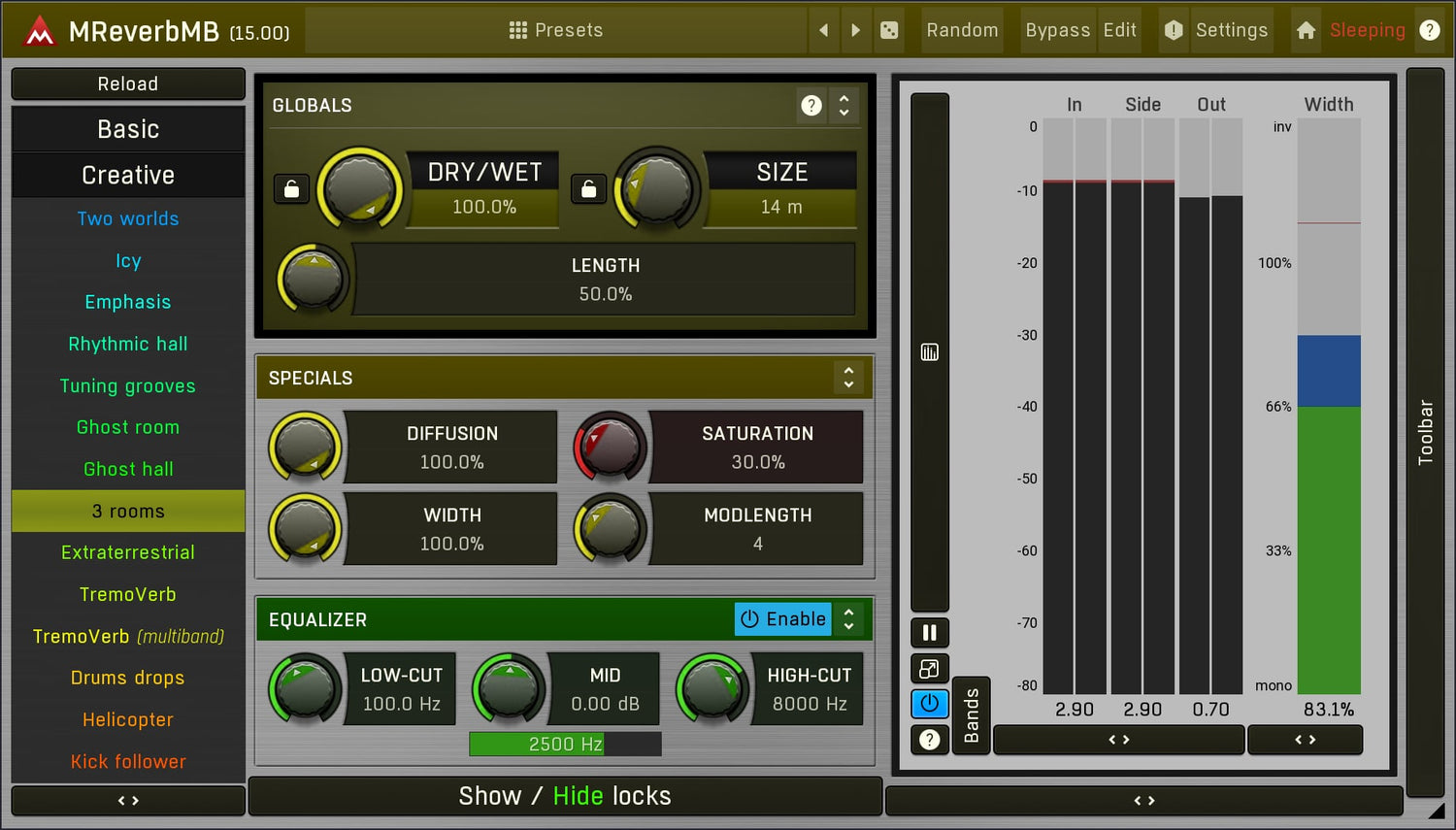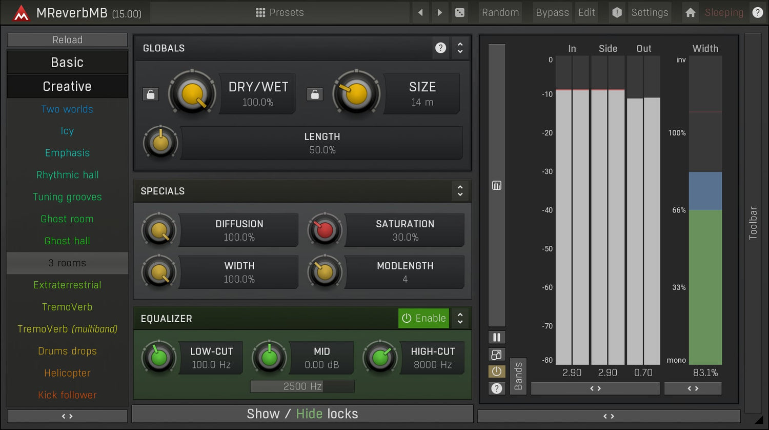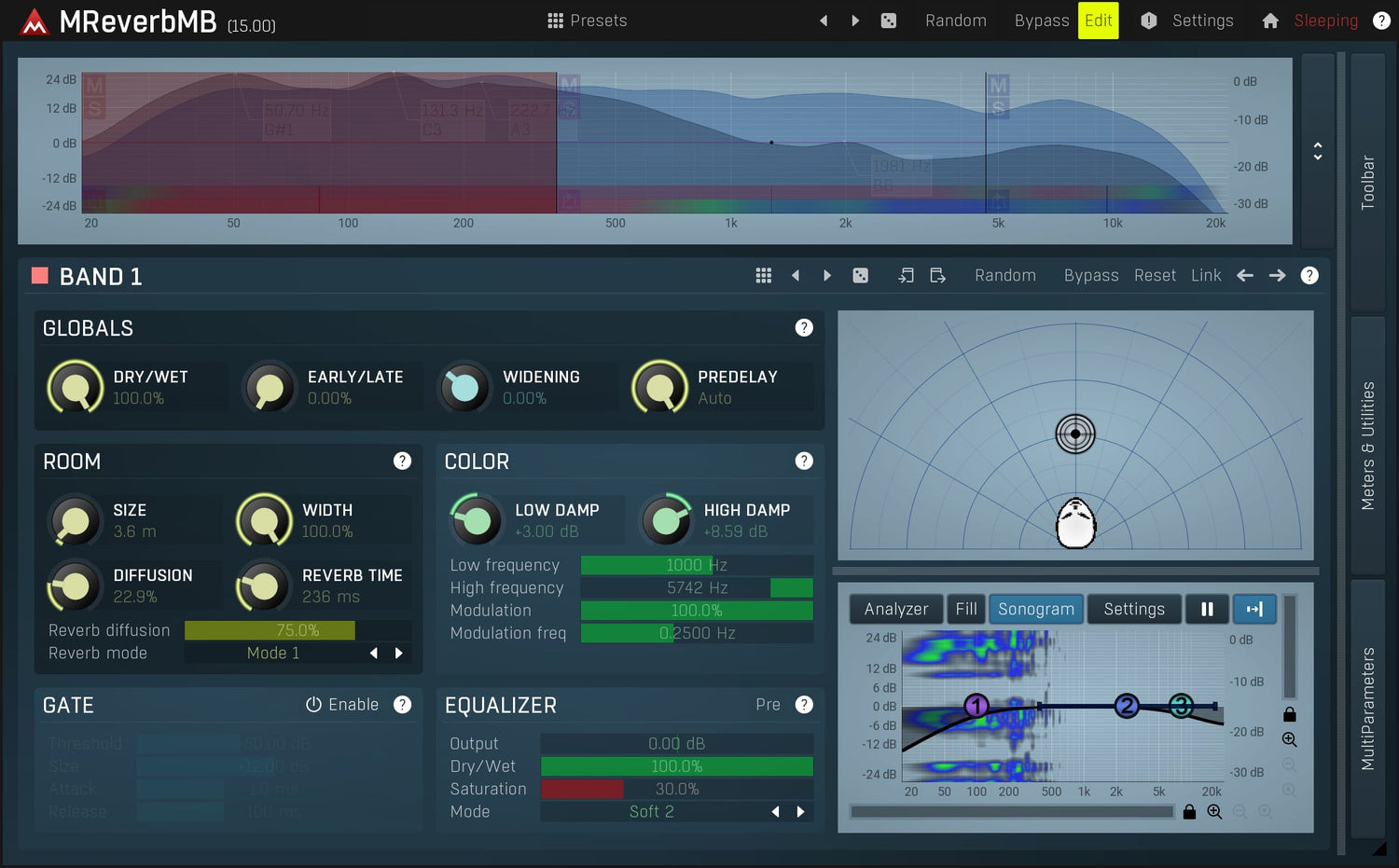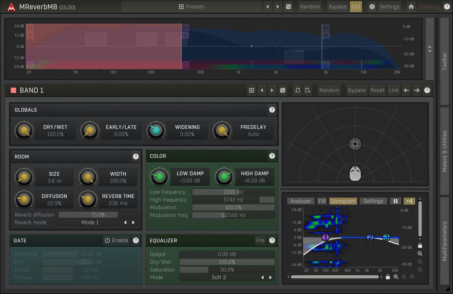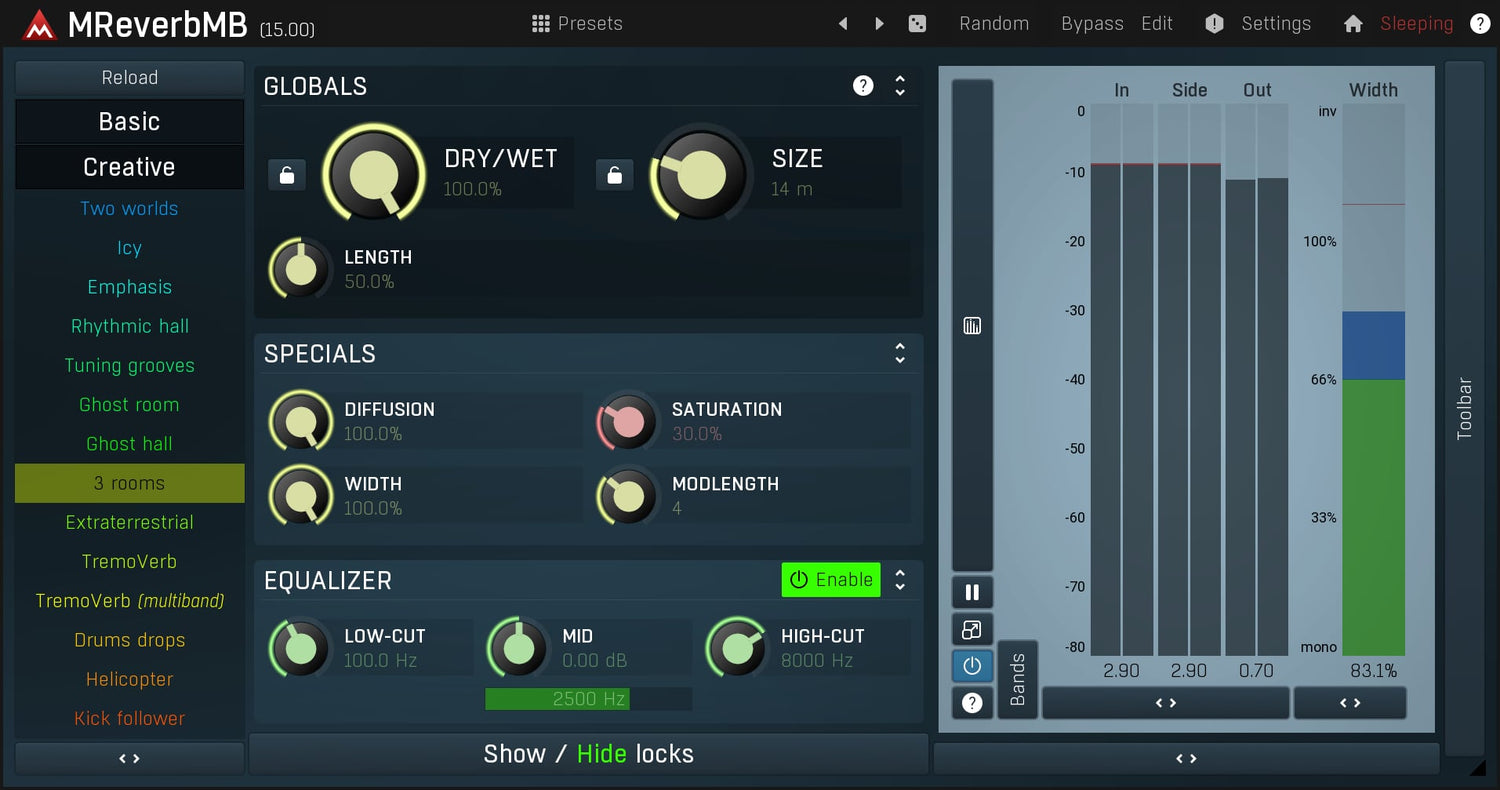 MReverbMB utökar möjligheterna långt bortom standardkvalitetsreverb genom att låta dig bearbeta upp till 6 distinkta band samtidigt. Denna reverb plugin kan erbjuda allt från extremt realistiska hallar till otroliga effekter.