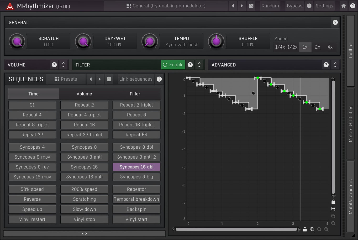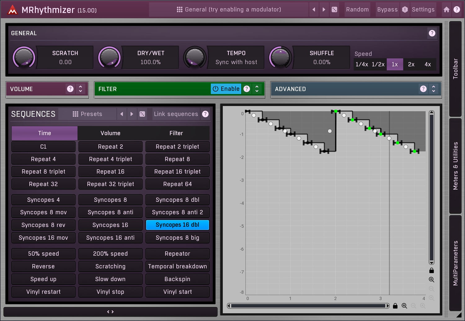 Från gating till glitching, repeating till scratching, allt med fantastisk ljudkvalitet, det är MRhythmizer, en unik tidsmanipulationseffekt som använder en integrerad sequencer för att kontrollera tid, volym och filter.