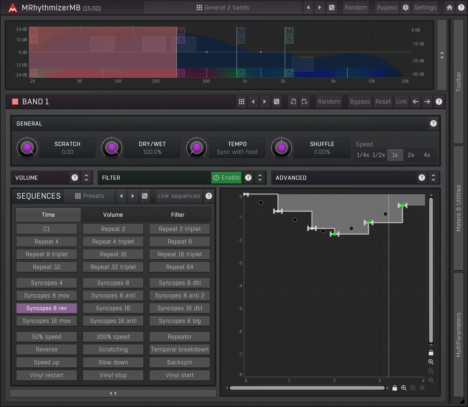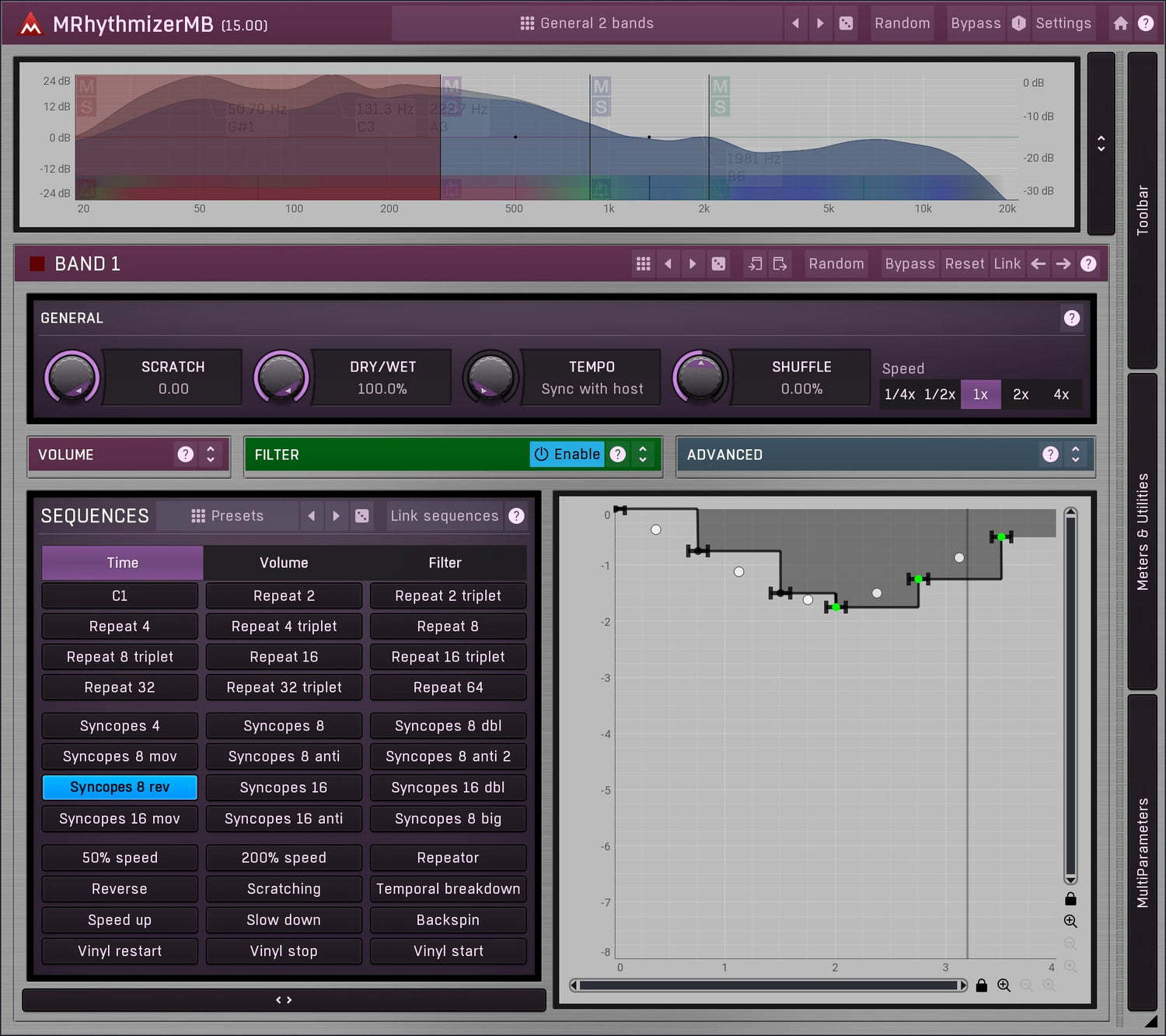 Från gating till glitching, upprepande hits till scratching, allt med fantastisk ljudkvalitet och upp till 6 distinkta band, det är MRhythmizerMB. En unik tidsmanipulationseffekt som använder en integrerad sequencer för att kontrollera tid, volym och filter. MRhythmizerMB ger liv åt din musik, säg adjö till tråkiga ljudframträdanden!