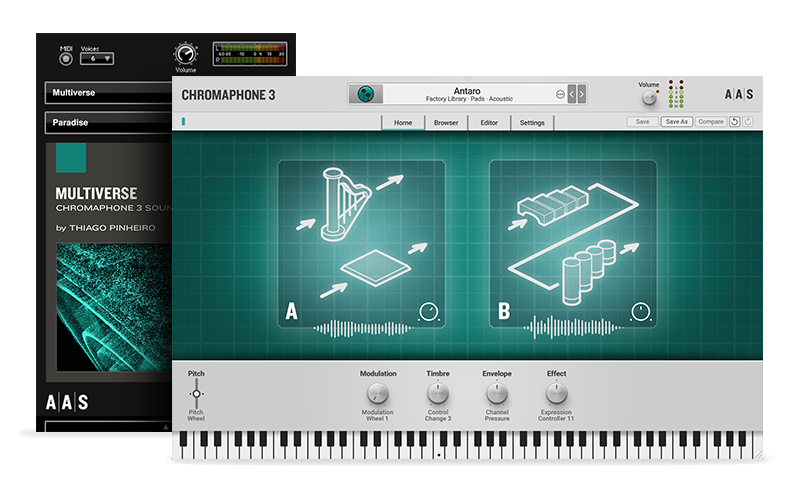 Långtids AAS bidragsgivare Thiago Pinheiro levererar den högst mångsidiga Multiverse, hans första bidrag till Sound Bank Series. Denna 100-presets samling innehåller utomjordiska texturer, ovanliga melodiska och percussiva element samt en rad dynamiskt rika instrument som är särskilt väl lämpade för filmiska soundtracks och ljuddesign.