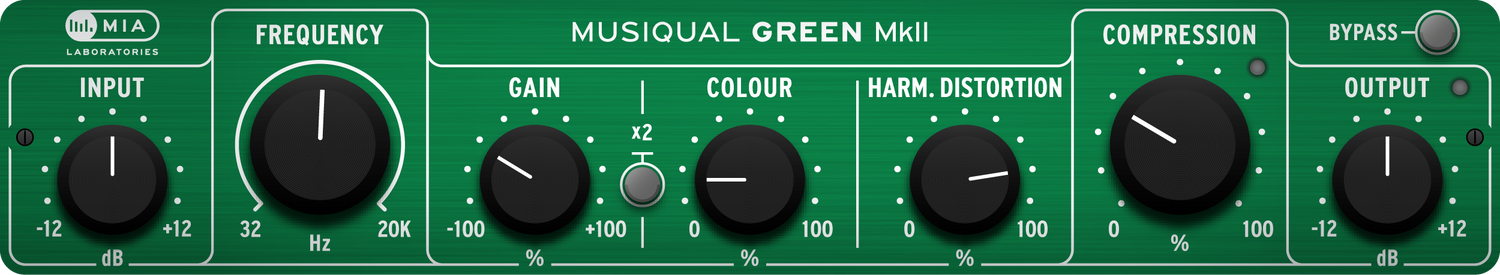 Musiqual Greens EQ ger ett ganska transparent ljud med en "Transistor"-smak som är mycket karaktäristisk för analog teknik. Användaren har full kontroll inom 20Hz – 20kHz-intervallet, eftersom det inte finns några specifika, förutbestämda band som i de andra Musiqual-verktygen. Dess "Färg" är mjuk och diskret. Transistor- eller op-amp-kretsförstärkarna visar en stark komponent av "3:e ordningens harmonisk distorsion". Den harmoniska distorsionskomponenten i Musiqual Green simulerar detta karaktäristiska ljud, den introducerar udda harmoniker, där den 3:e är den mest framträdande. Användaren kan noggrant ställa in mängden distorsion som läggs till signalen.