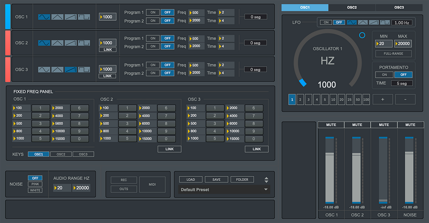 - Utgångsrouting: Rutta oscillatorer och brusgeneratorutgångar till upp till 6 ljudkortutgångar beroende på dina behov.