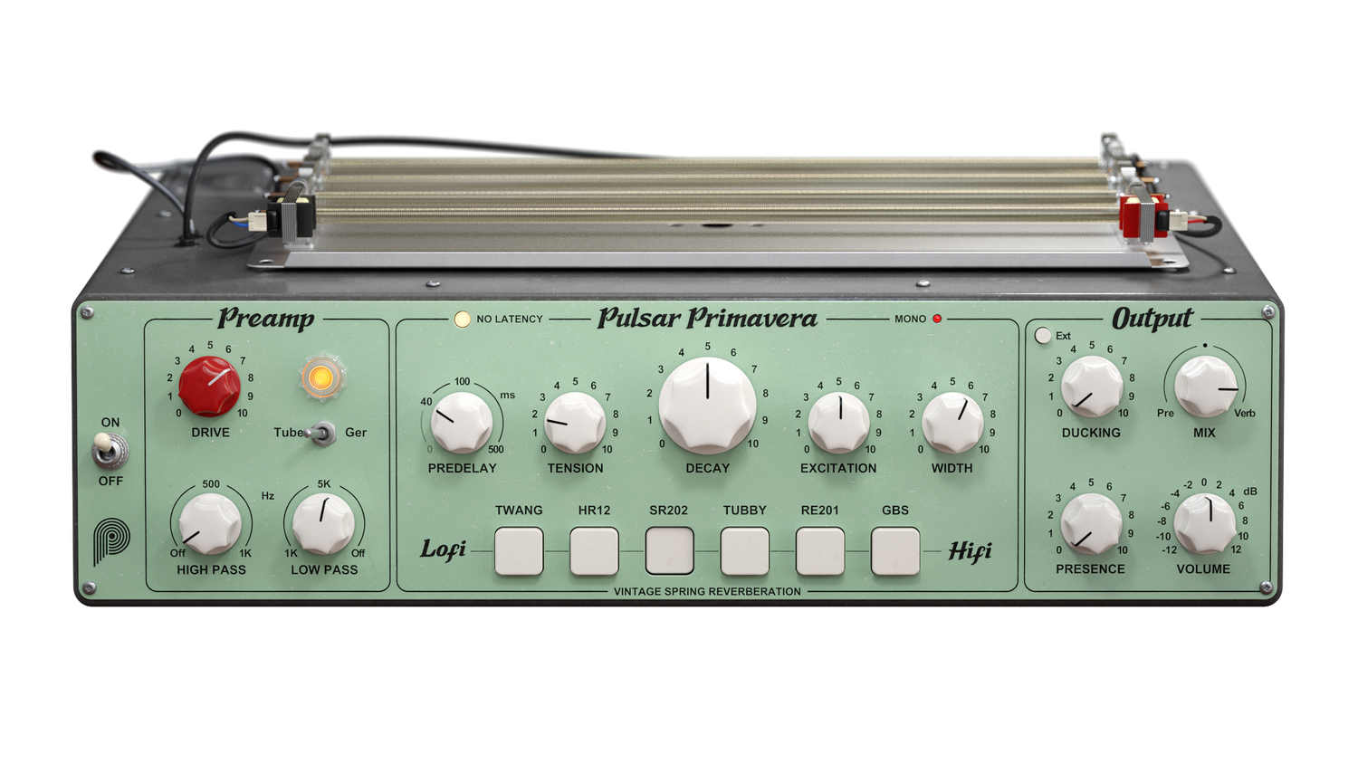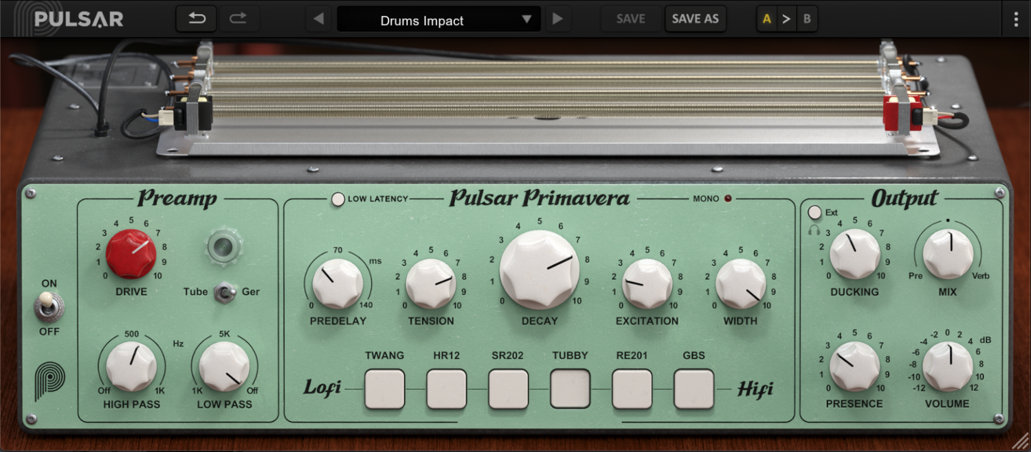 Pulsar Primavera är en 6-i-1 reverberation plugin som inkluderar enheter som hörts på otaliga hits genom tiderna. Från lo-fi till hi-fi, emulerar varje tank exakt de ursprungliga enheternas elektroniska och mekaniska beteende. Dessutom erbjuder exklusiva fjädrar och excitationkontroller en bredare ljudpalett än typiska konvolutionsmodeller.