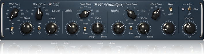 PSP NobleQex är en utökad version av PSP NobleQ. Den erbjuder alla funktioner hos PSP NobleQ kombinerat med ett extra mellanbellfilter och en justerbar låg hylldipfrekvensskift.