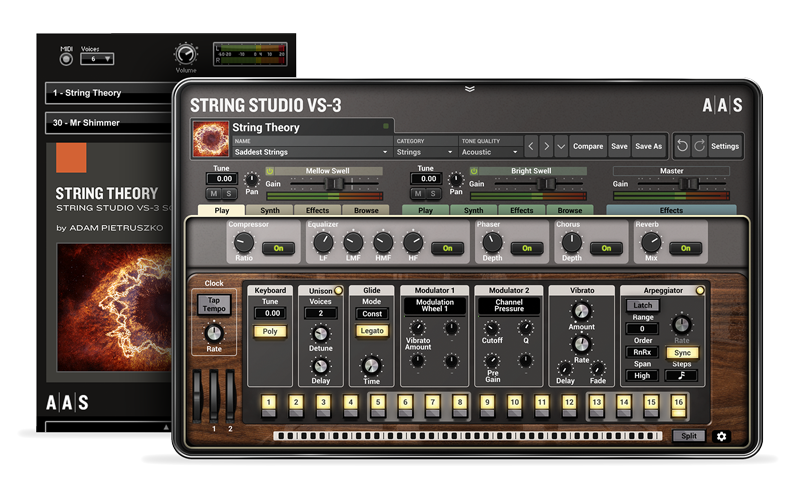 Med String Theory utnyttjar Adam Pietruszko noggrant String Studio VS-3:s tvåstämiga multitimbralitet och MIDI-styrda ljudvariationer för att leverera rika, komplexa och raffinerade ljud.