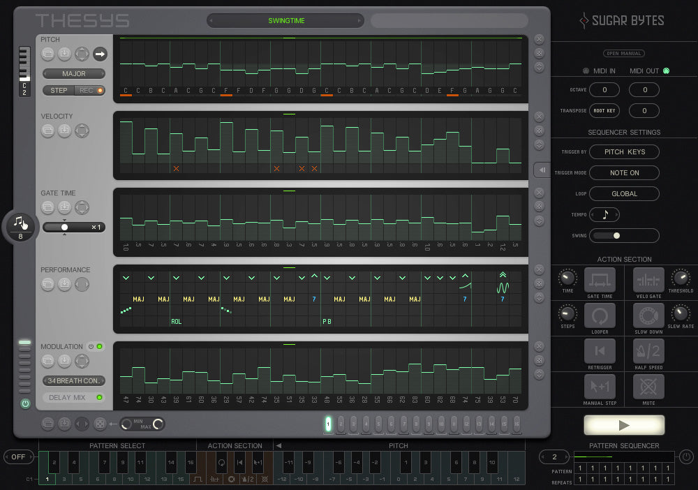 Upp till 16 fullständiga mönster kan skapas inom ett enda projekt. De kan sekvenseras inom Pattern Sequencer (nederst till höger) eller utlösas via Tangentbordet (inställt på "Pitch"), där hela längden av tangentbordet används för att transponera det aktuella mönstret. Växla till "Performance" och tangentbordet delas in i 3 zoner: Pattern Select, Action Section och ett Område för tonhöjdstransponering.