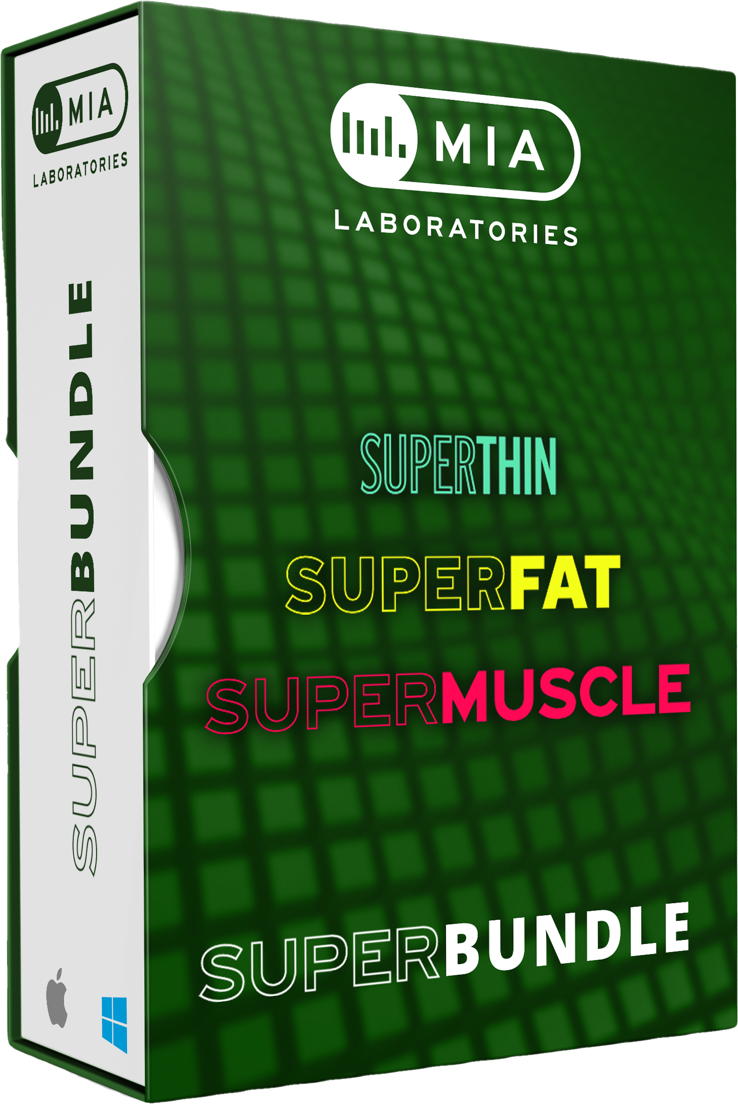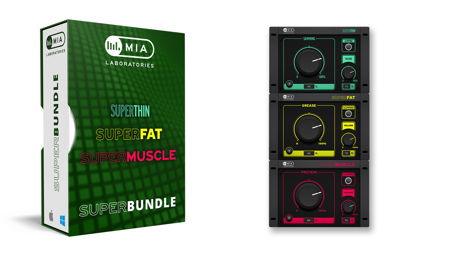 SUPER FAT, THIN and MUSCLE är One-Knob stil plug-ins som är resultatet av en kombination av Mia Labs Musiqual Red, Musiqual Blue, Musiqual Green plug-ins och en sista touch av Pi&Phi-magi.