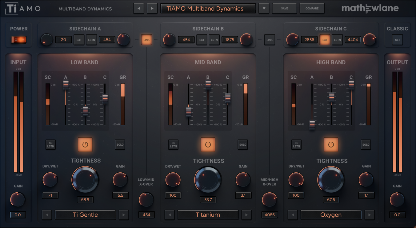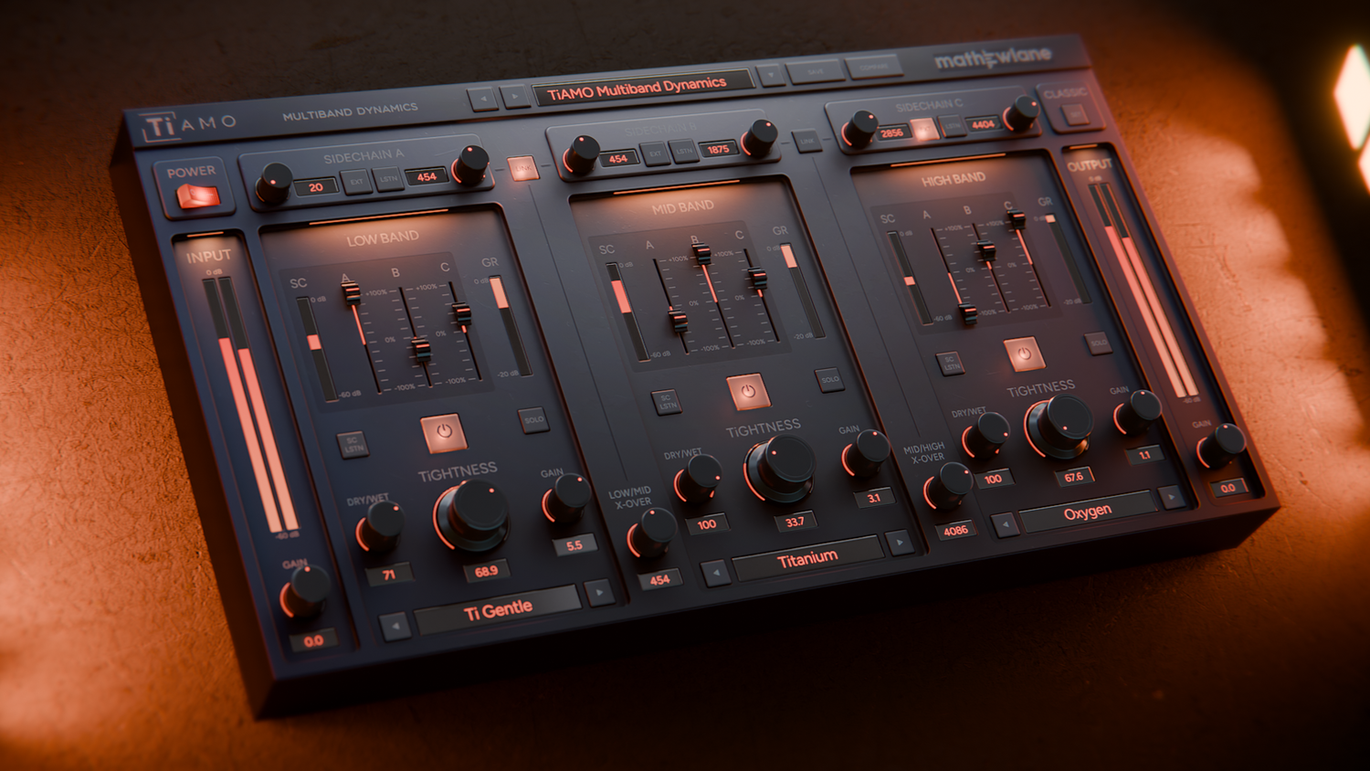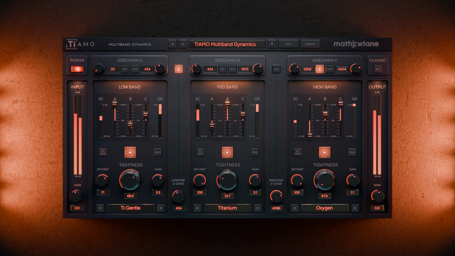 TiAMO är en unik multiband dynamics plugin med 3 separata sidechains. Varje band har kraftfull mixing av sidechain-trigger för organiska och levande dynamiker. Från klassisk trebandskompression, över de-essing till musikalisk pumping, avancerad groove-skapande och mer. Allt med lättanvända TiCo-baserade analoga kompressormodeller.