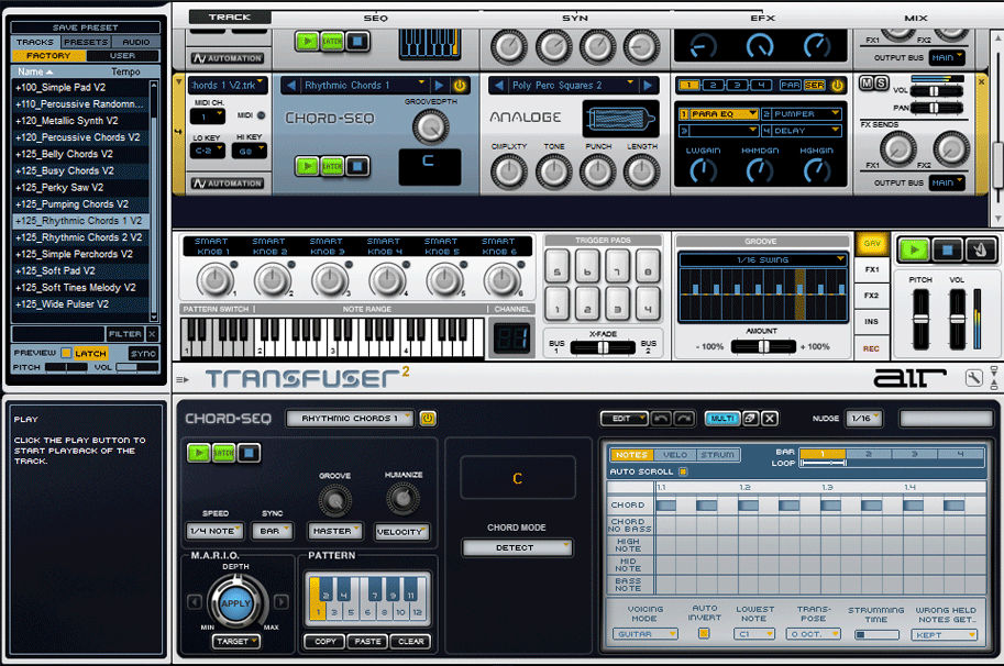 Transfuser 2 fungerar också som ett inspirerande kompositionsverktyg som intelligent genererar ackord, melodier, variationer och grooves baserat på en musikalisk analys av din låt. Dessutom kommer Transfuser 2 med ett premiumbibliotek av trummor och instrument som inkluderar 3,200+ loopar och 1200+ trummaskinsljud för omedelbar musikexperimentering.