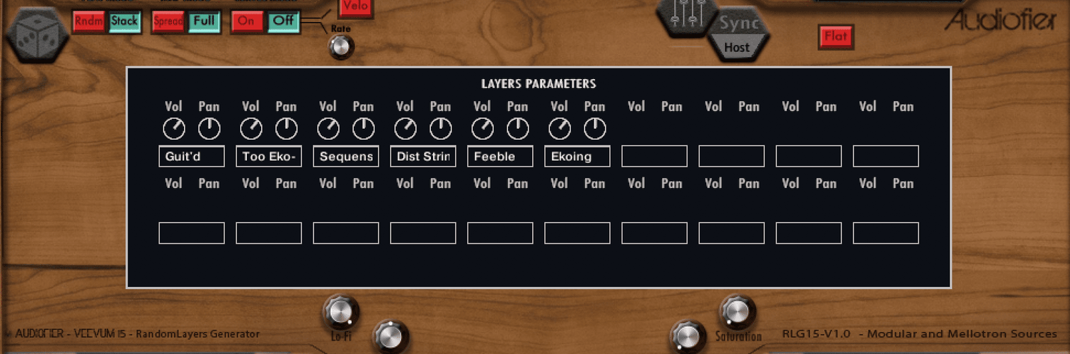 När ljudkällorna har valts (upp till 20 på en gång i VEEVUM SYNC MOD-TRON), kan de spelas på flera sätt: RANDOM kommer att välja en annan ljudkälla per spelad ton, STACK kommer att spela alla ljudkällor på en gång (FULL STACK) eller kommer att fördela alla valda ljudkällor över tangentbordet (SPREAD STACK). FULL STACK kan också crossfade varje ljudkälla med individuella volym Lfo:s för att skapa utvecklande texturer (STACK CURVE MODE).