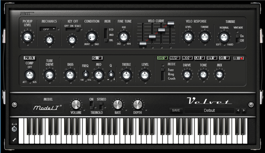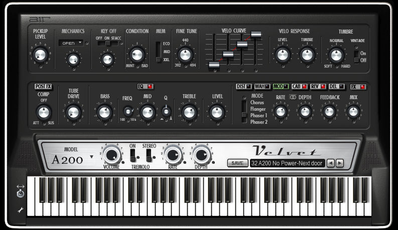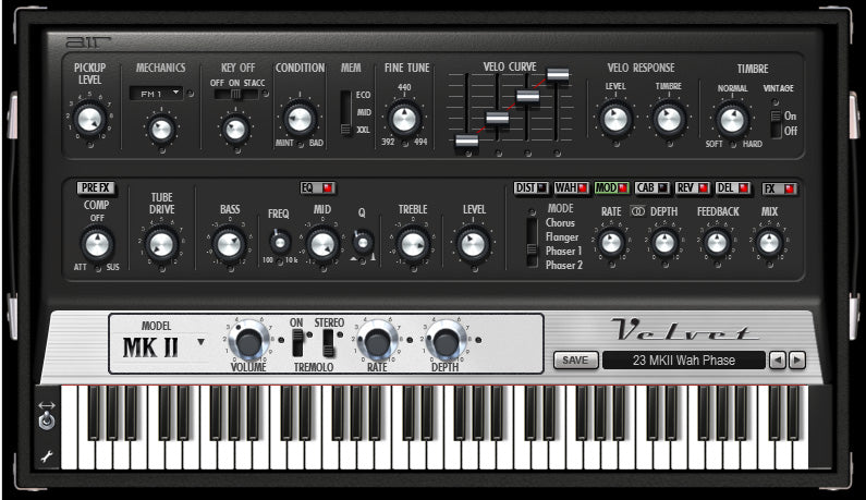 Baserat på Fender Rhodes Suitcase, Fender Rhodes MK I och MK II Stage Pianos, Wurlitzer 200A och Hohner Pianet-T, emulerar Velvet noggrant ljudkvaliteten, responsen och nyanserna från varje originalinstrument för att ge liv åt dina pianospår.
