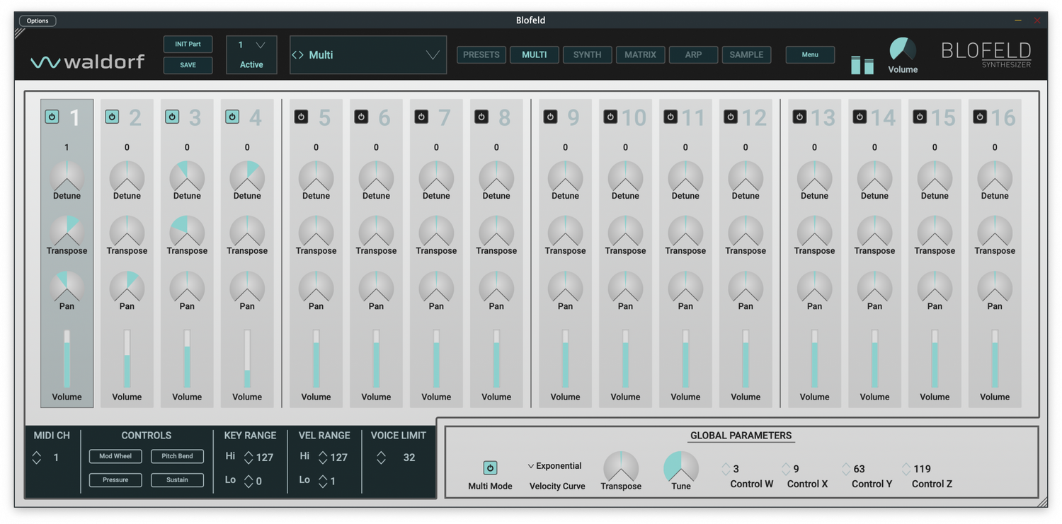 - Multi-instrument mixer med volym, panorering, avstämning, transponering och många fler parametrar